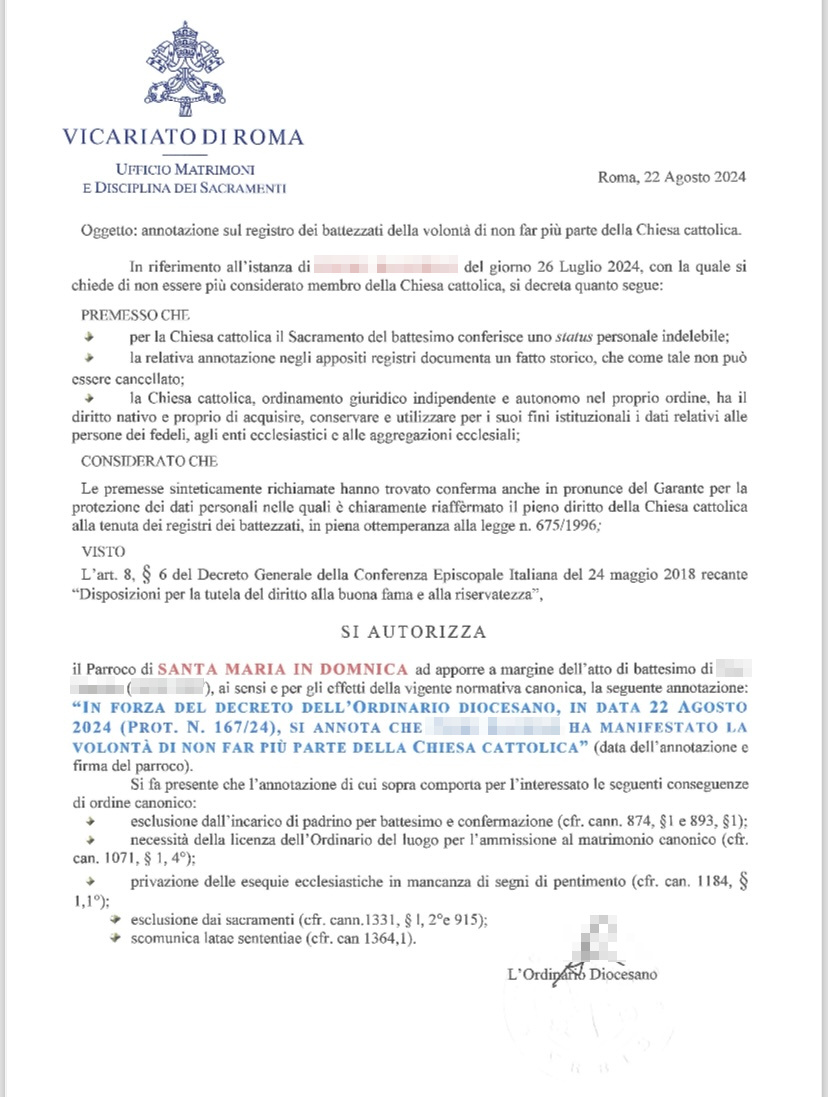 Una persona ha chiesto la rettifica dei dati relativi al proprio battesimo avvenuto a S. Maria in Domnica alla Navicella - ROMA (RM) il 22/08/2024, dichiarando di non voler più far parte della Chiesa Cattolica.