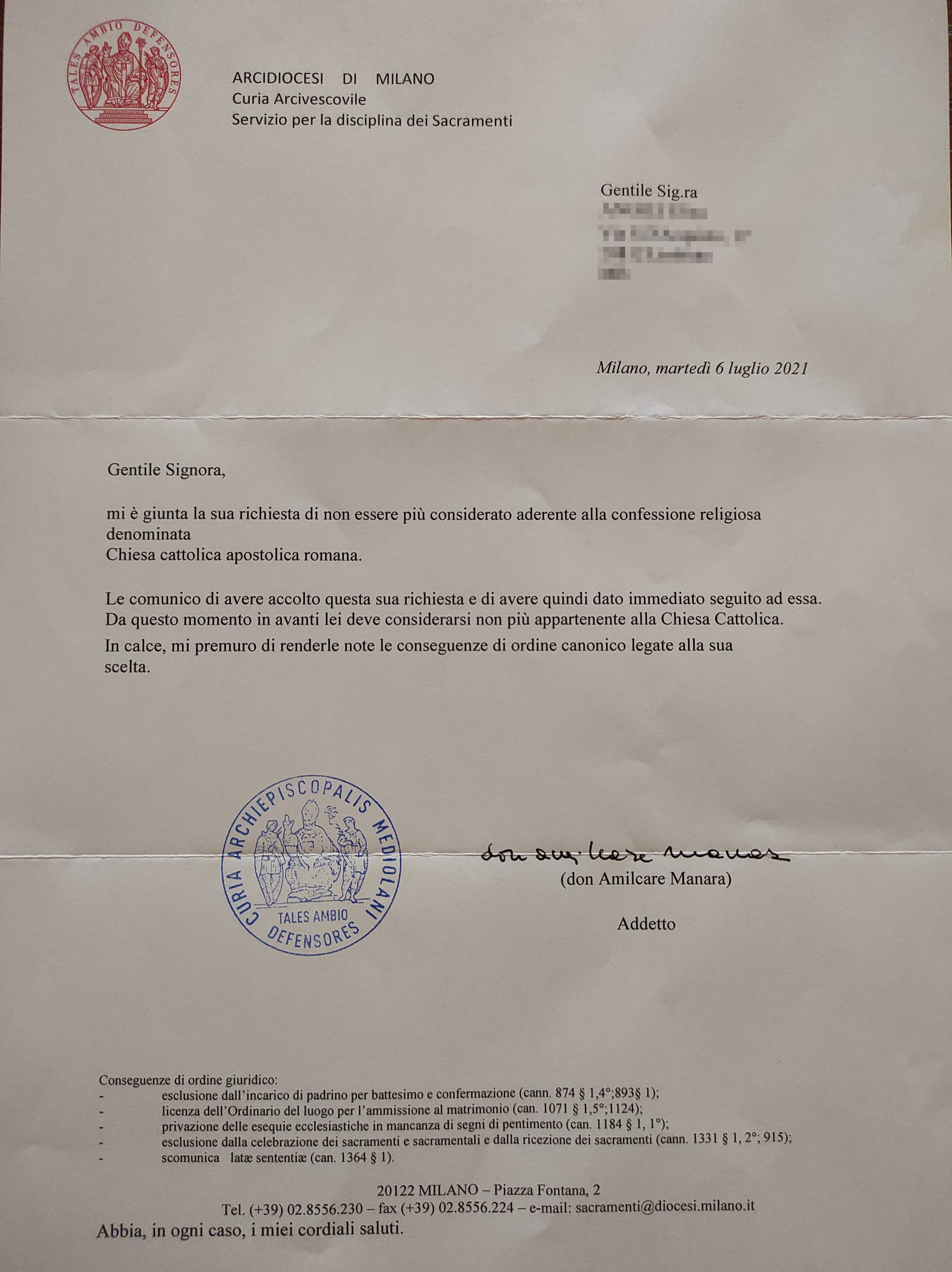 Una persona ha chiesto la rettifica dei dati relativi al proprio battesimo avvenuto a San Giorgio - LIMBIATE (MB) il 16/07/2021, dichiarando di non voler più far parte della Chiesa Cattolica.