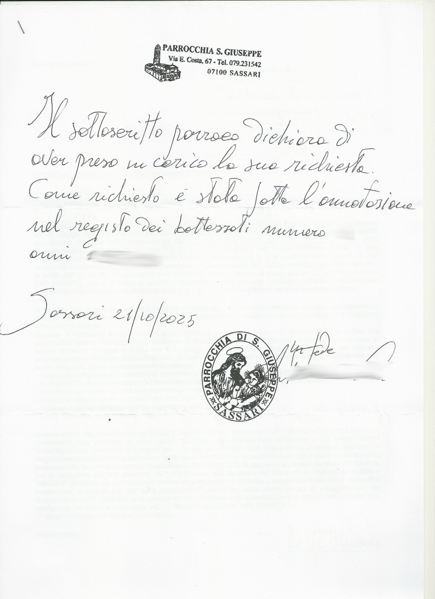 Una persona ha chiesto la rettifica dei dati relativi al proprio battesimo avvenuto a S. Giuseppe - SASSARI (SS) il 21/10/2025, dichiarando di non voler più far parte della Chiesa Cattolica.