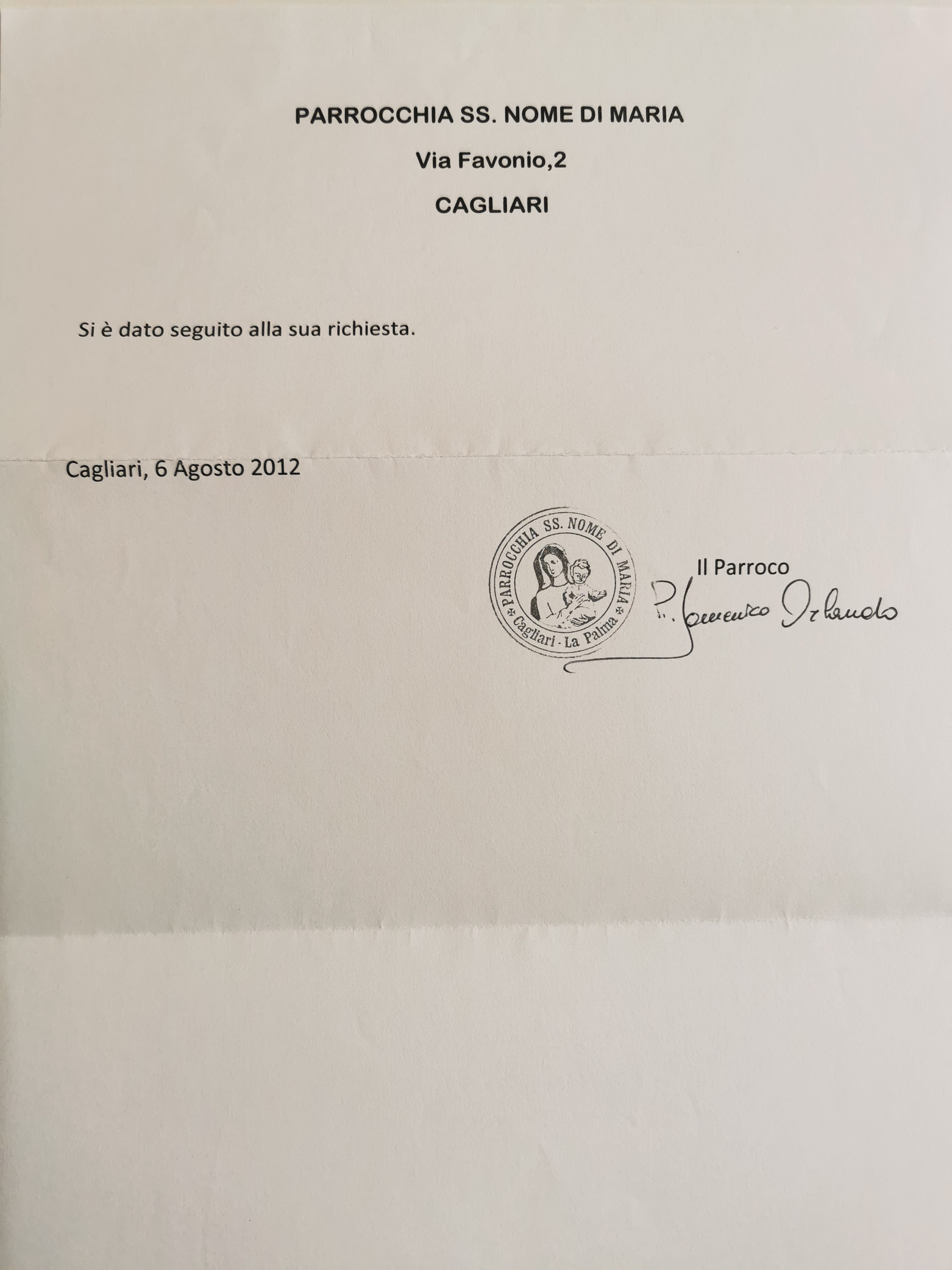 Una persona ha chiesto la rettifica dei dati relativi al proprio battesimo avvenuto a Ss. Nome di Maria - CAGLIARI (CA) il 06/08/2012, dichiarando di non voler più far parte della Chiesa Cattolica.