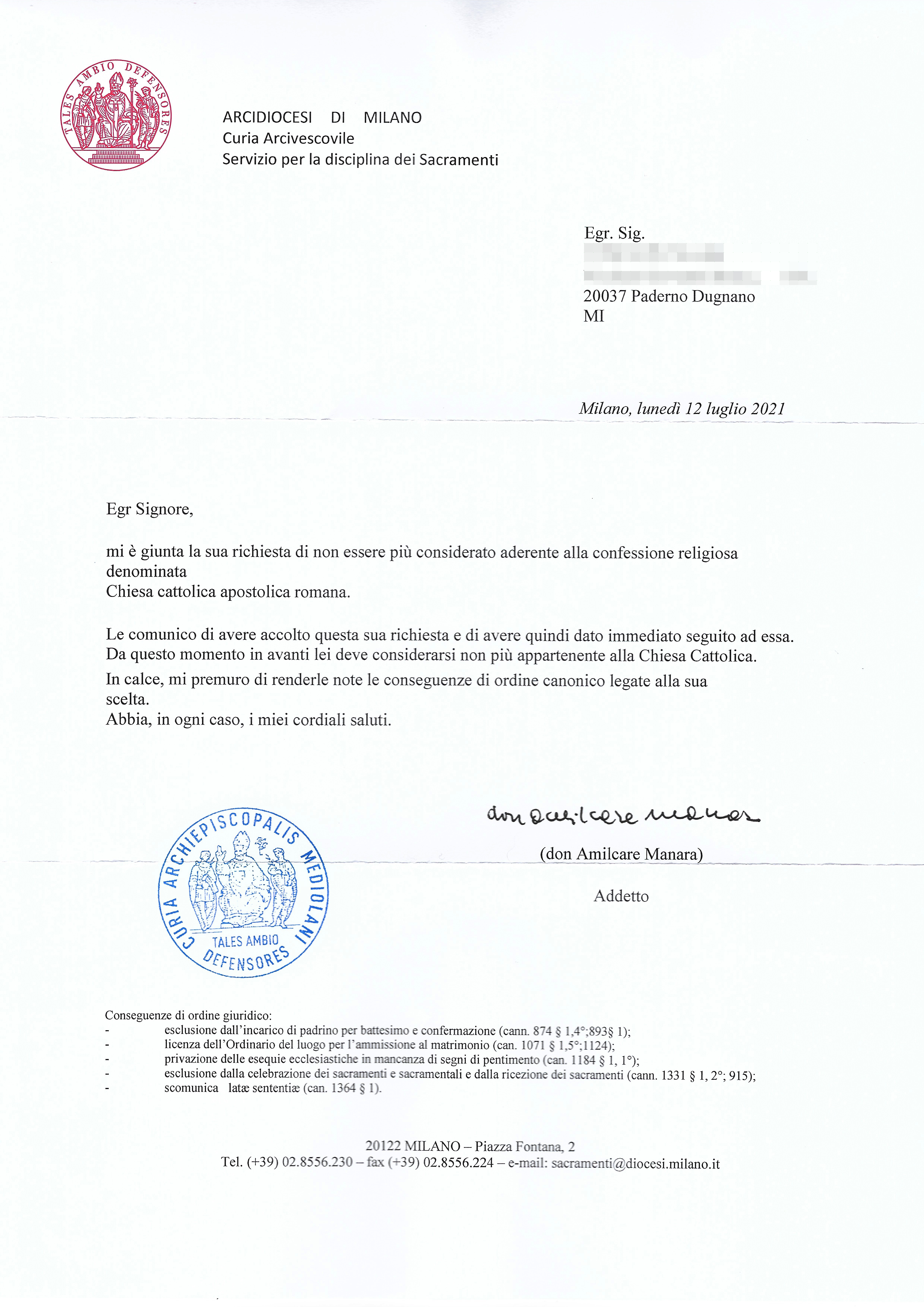 Una persona ha chiesto la rettifica dei dati relativi al proprio battesimo avvenuto a Santa Maria Nascente - PADERNO DUGNANO (MI) il 16/07/2021, dichiarando di non voler più far parte della Chiesa Cattolica.