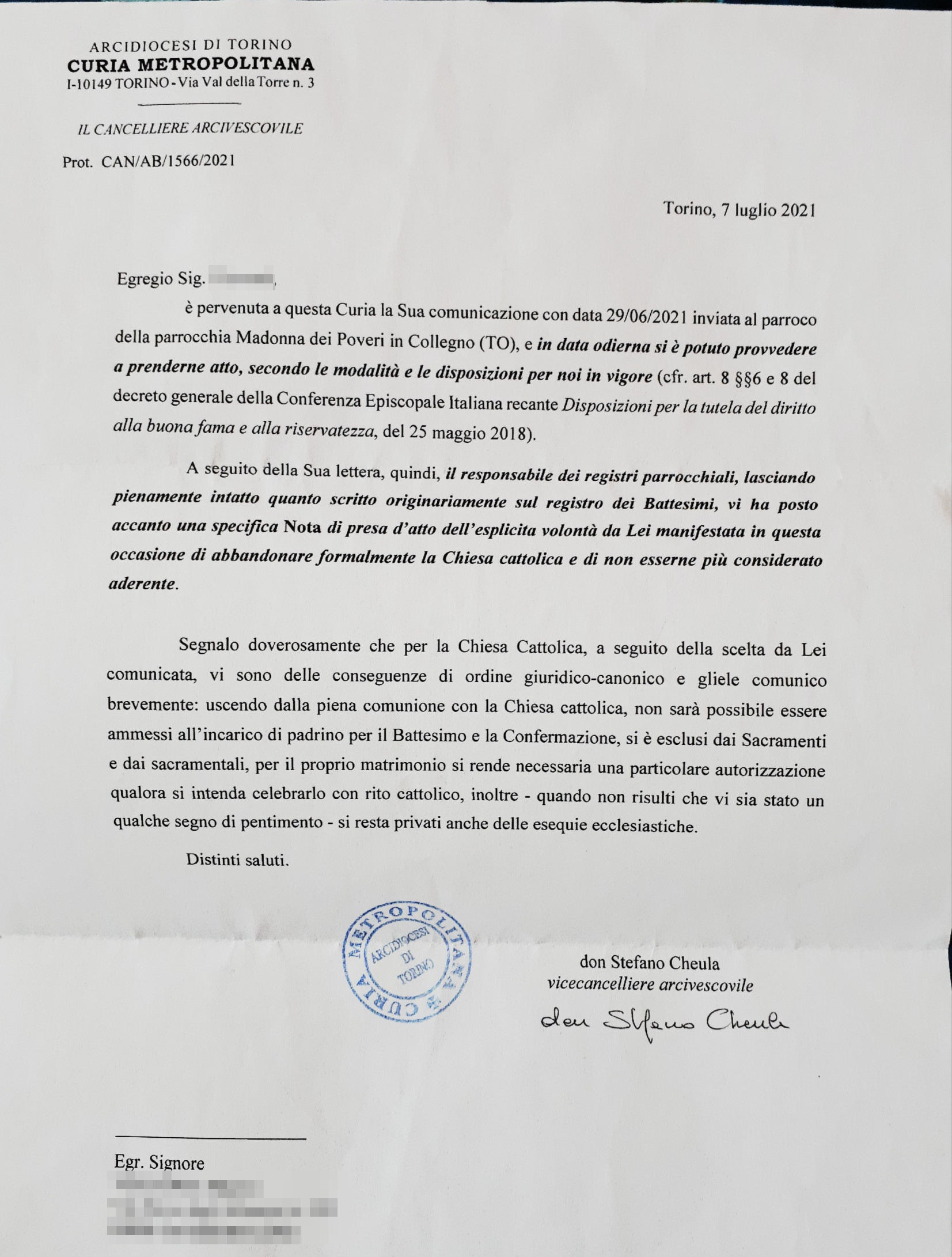 Una persona ha chiesto la rettifica dei dati relativi al proprio battesimo avvenuto a Madonna dei poveri - COLLEGNO (TO) il 07/07/2021, dichiarando di non voler più far parte della Chiesa Cattolica.