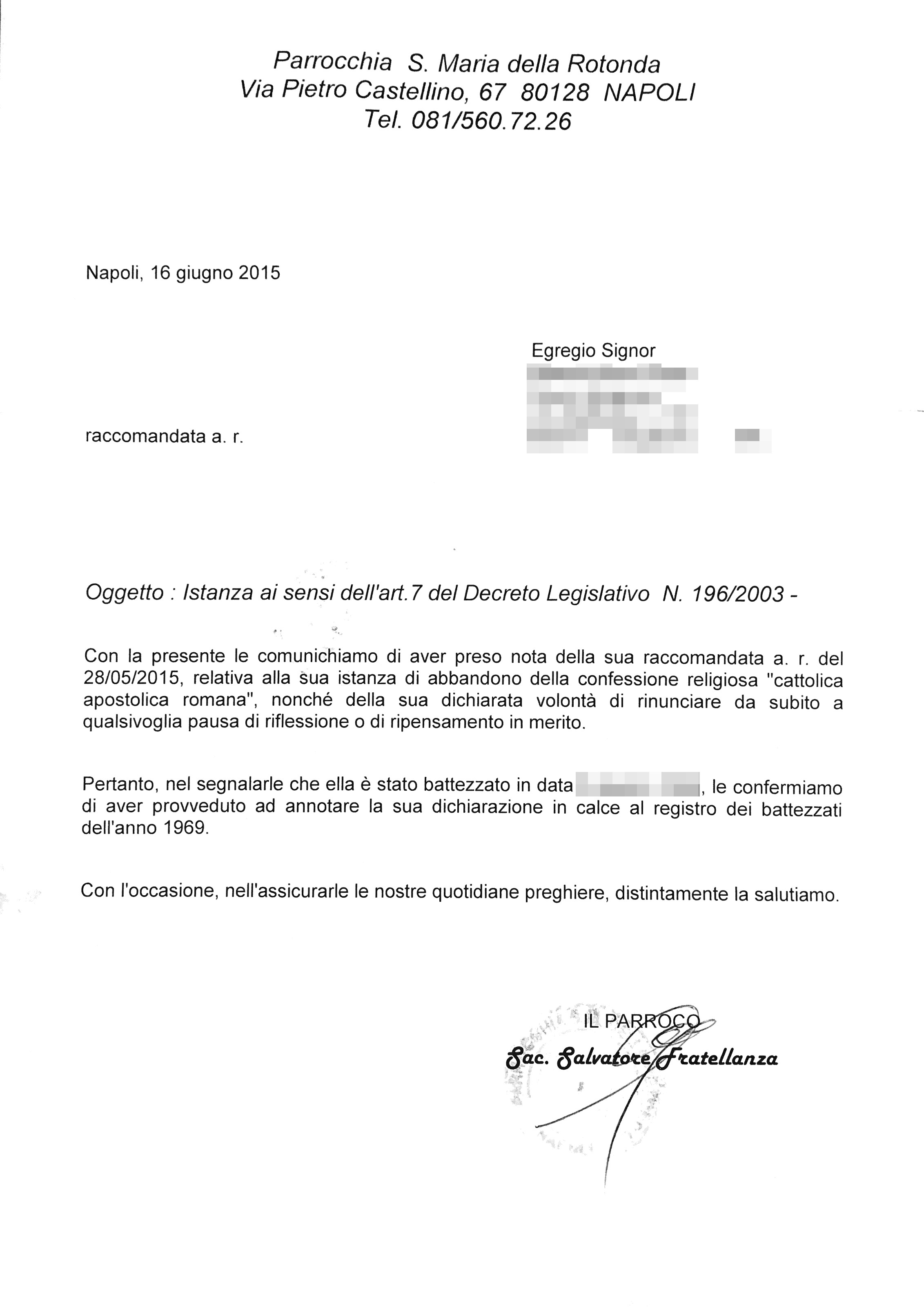 Una persona ha chiesto la rettifica dei dati relativi al proprio battesimo avvenuto a S. Maria della Rotonda - NAPOLI (NA) il 16/06/2015, dichiarando di non voler più far parte della Chiesa Cattolica.