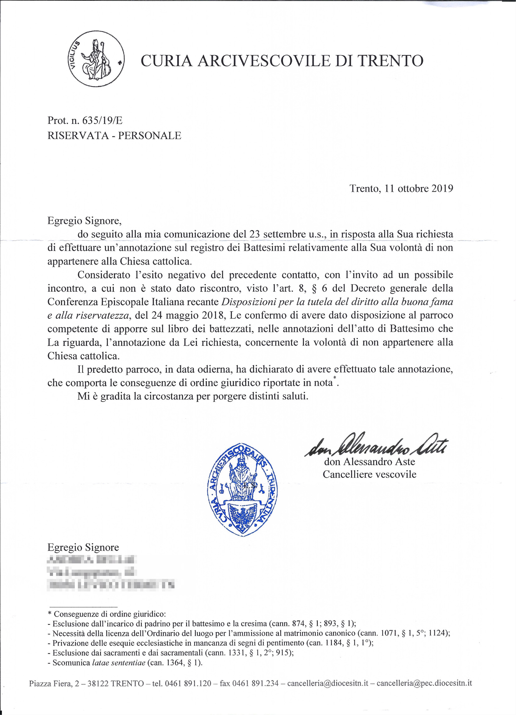 Una persona ha chiesto la rettifica dei dati relativi al proprio battesimo avvenuto a Santissimo Redentore - LEVICO TERME (TN) il 11/10/2019, dichiarando di non voler più far parte della Chiesa Cattolica.
