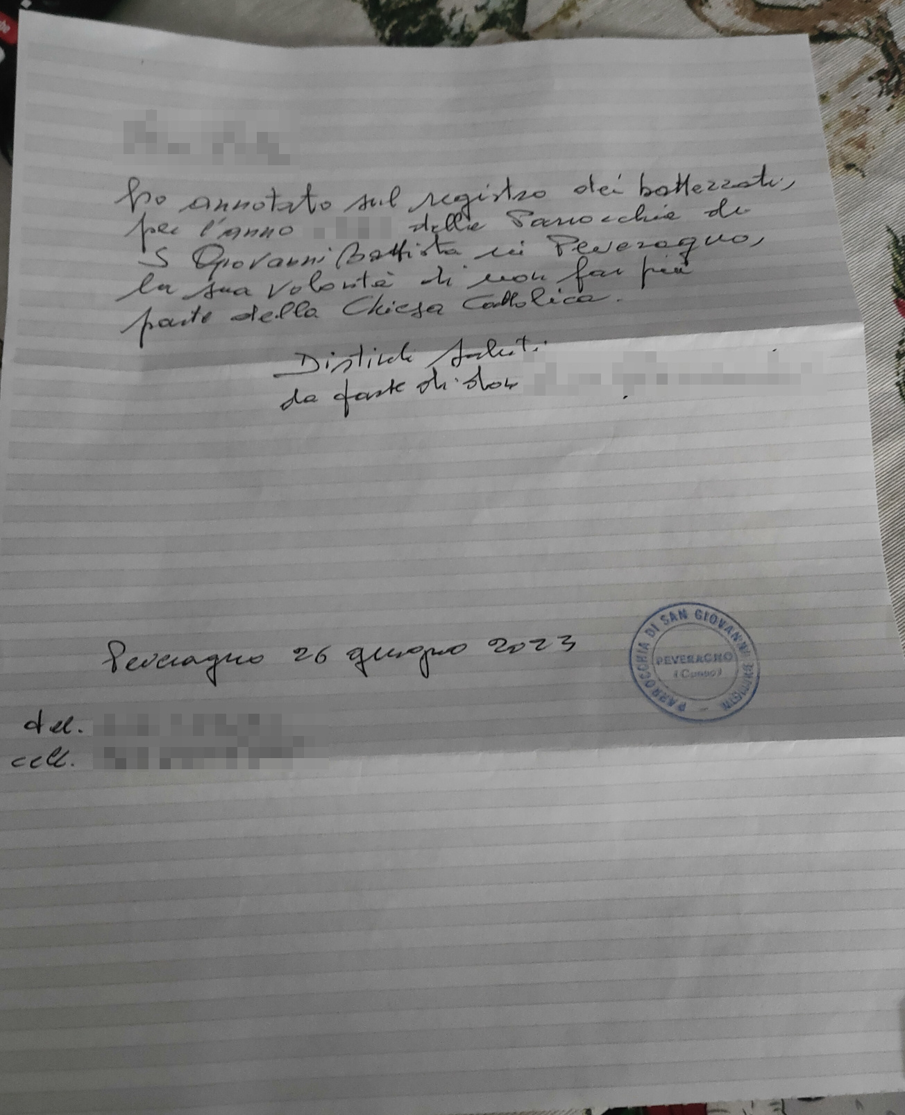 Una persona ha chiesto la rettifica dei dati relativi al proprio battesimo avvenuto a S. Giovanni Battista - PEVERAGNO (CN) il 26/06/2023, dichiarando di non voler più far parte della Chiesa Cattolica.