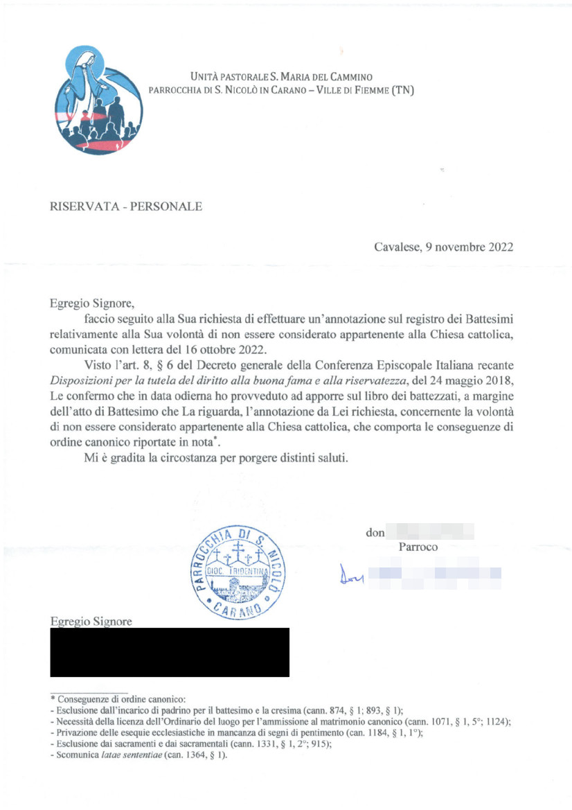 Una persona ha chiesto la rettifica dei dati relativi al proprio battesimo avvenuto a San Nicolò - VILLE DI FIEMME (TN) il 09/11/2022, dichiarando di non voler più far parte della Chiesa Cattolica.