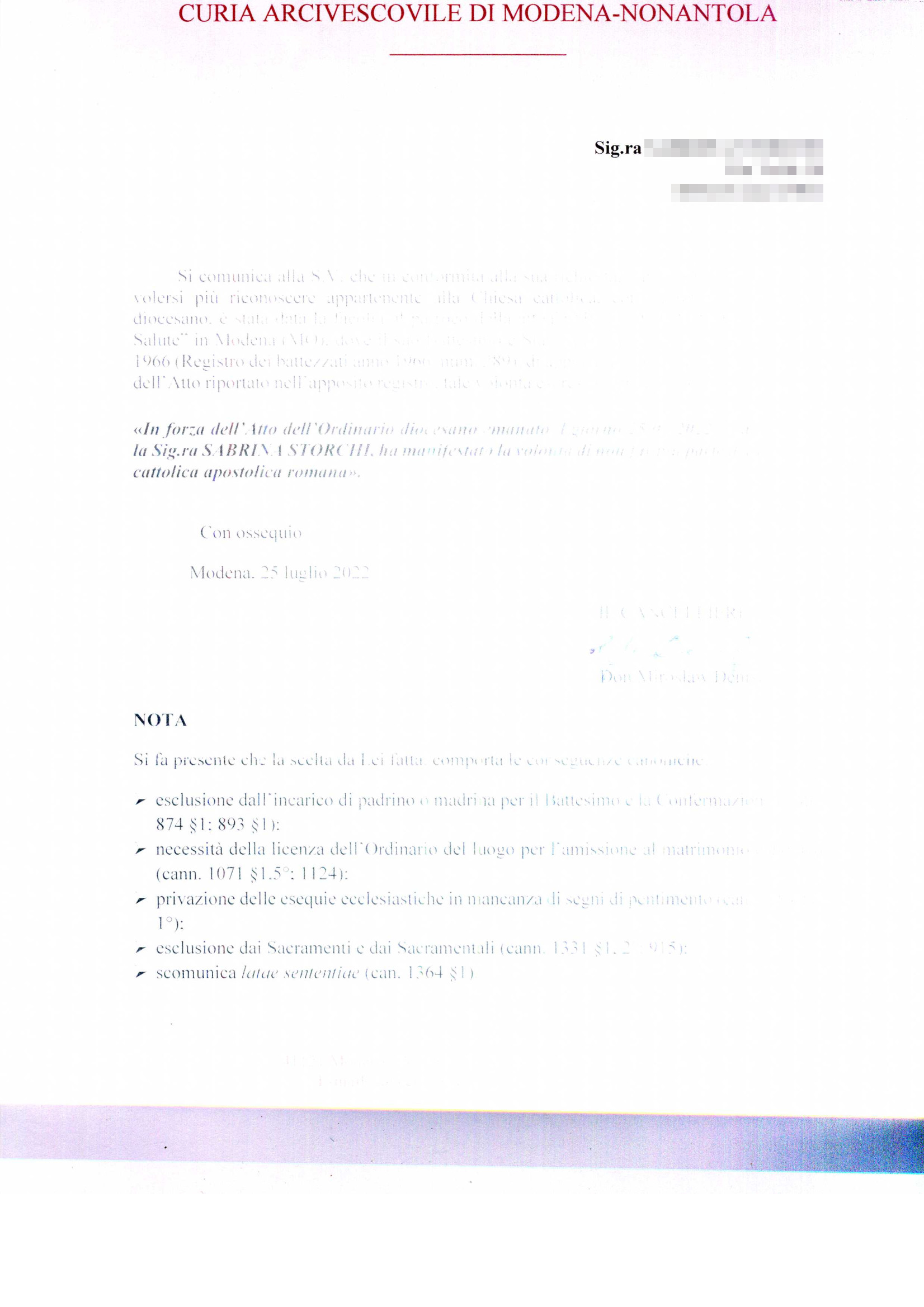 Una persona ha chiesto la rettifica dei dati relativi al proprio battesimo avvenuto a Beata Vergine della Salute - MODENA (MO) il 25/07/2022, dichiarando di non voler più far parte della Chiesa Cattolica.