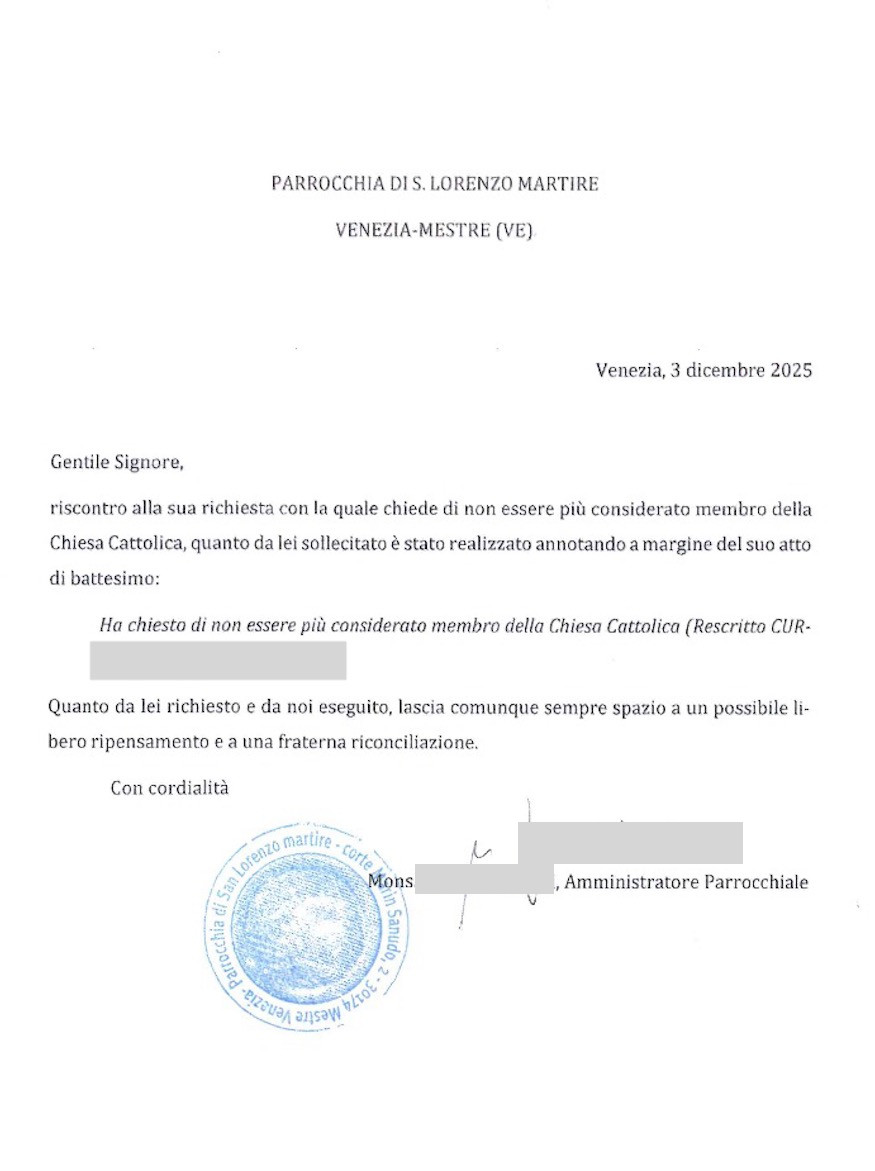 Una persona ha chiesto la rettifica dei dati relativi al proprio battesimo avvenuto a San Lorenzo Martire - VENEZIA (VE) il 03/12/2025, dichiarando di non voler più far parte della Chiesa Cattolica.