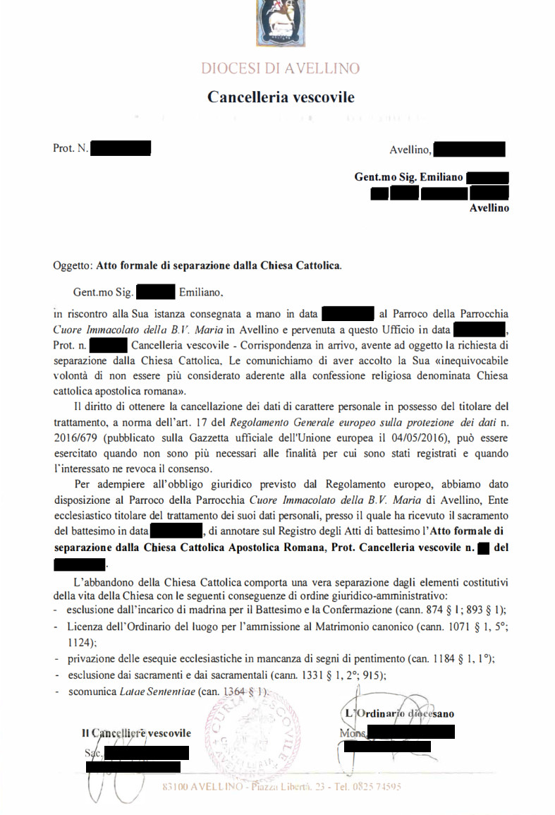 Vivendo de facto in una condizione di non aderenza alla Chiesa cattolica, ritengo opportuno formalizzare de iure tale distanza. In qualità di uomo di scienza, mi trovo in aperto contrasto con ogni dottrina fondata su atti di fede indimostrabili. Il contributo teoretico di Emanuele Severino sancisce l'impossibilità della creatio ex nihilo, che costituisce l’architrave della visione cattolica. Per le implicazioni di tale teoresi, mi trovo a rifiutare anche il concetto di salvezza come redenzione da una colpa originaria, nonché dell'intervento divino o di un aldilà. Pur nel disaccordo intellettuale, riconosco alla Chiesa cattolica una forza storico-politica che resta, ancora oggi, tra le più rilevanti del XXI secolo. Resto meravigliato infatti dalla sua imponente tradizione artistica, dal tentativo di fondare una prassi dell'amore universale, e dal supporto sociale che garantisce alle comunità.