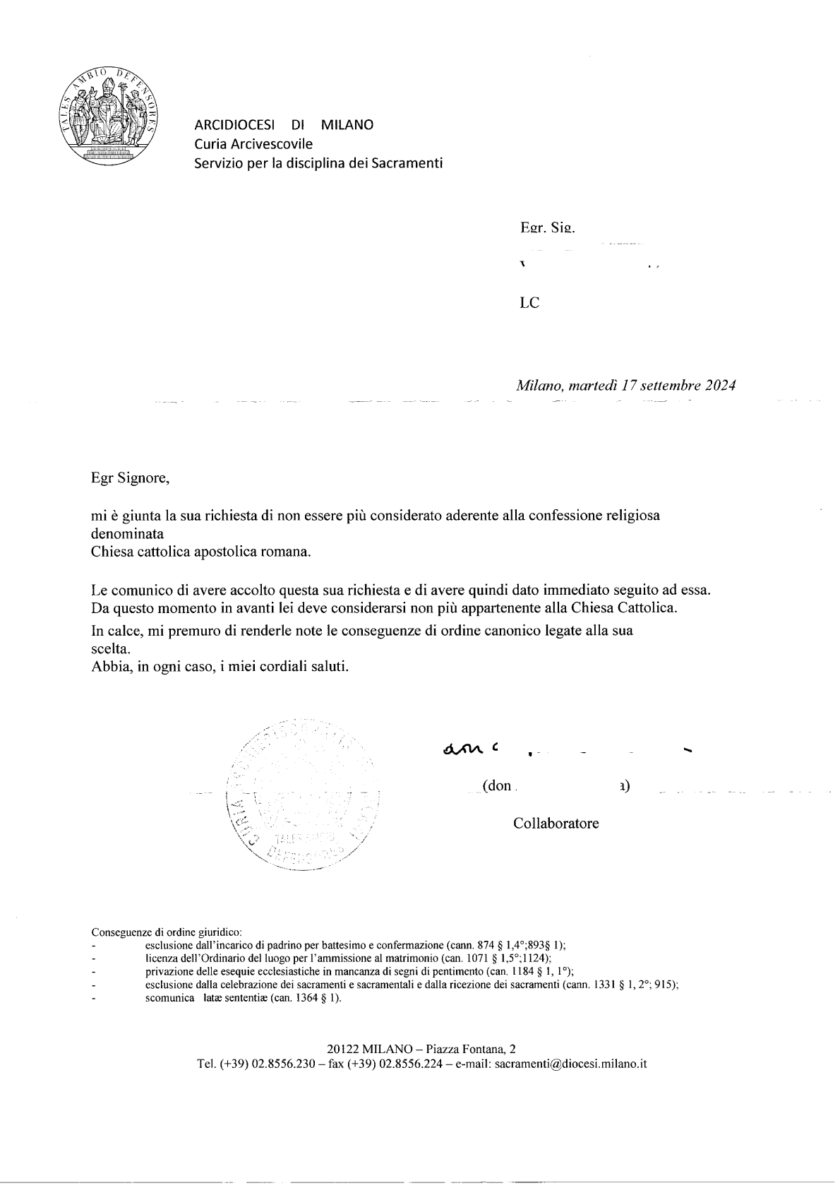Una persona ha chiesto la rettifica dei dati relativi al proprio battesimo avvenuto a S. Nicolò - LECCO (LC) il 17/09/2024, dichiarando di non voler più far parte della Chiesa Cattolica.