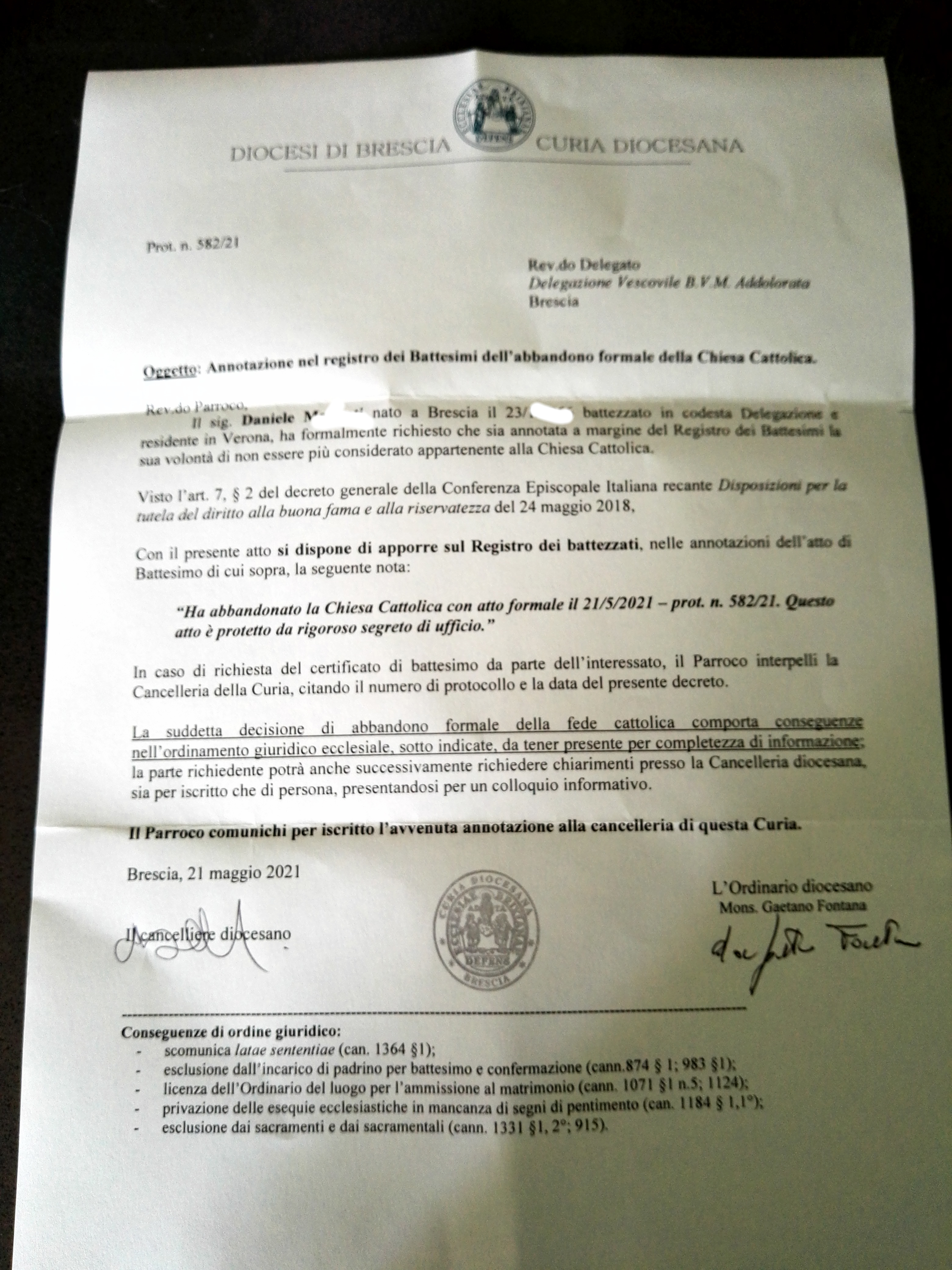Una persona ha chiesto la rettifica dei dati relativi al proprio battesimo avvenuto a Ss. Trinità - BRESCIA (BS) il 31/05/2021, dichiarando di non voler più far parte della Chiesa Cattolica.