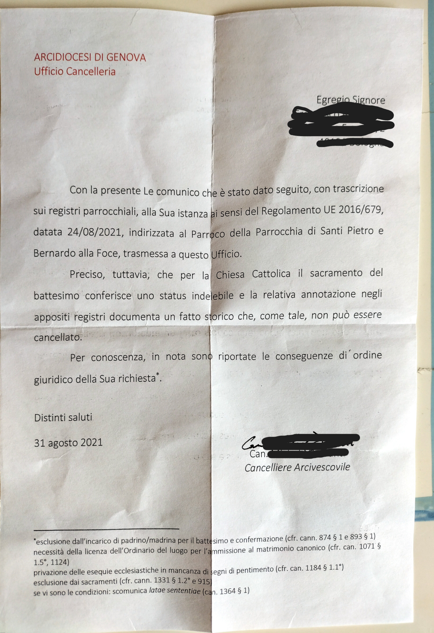 Una persona ha chiesto la rettifica dei dati relativi al proprio battesimo avvenuto a Santi Pietro e Bernardo alla Foce - GENOVA (GE) il 31/08/2021, dichiarando di non voler più far parte della Chiesa Cattolica.