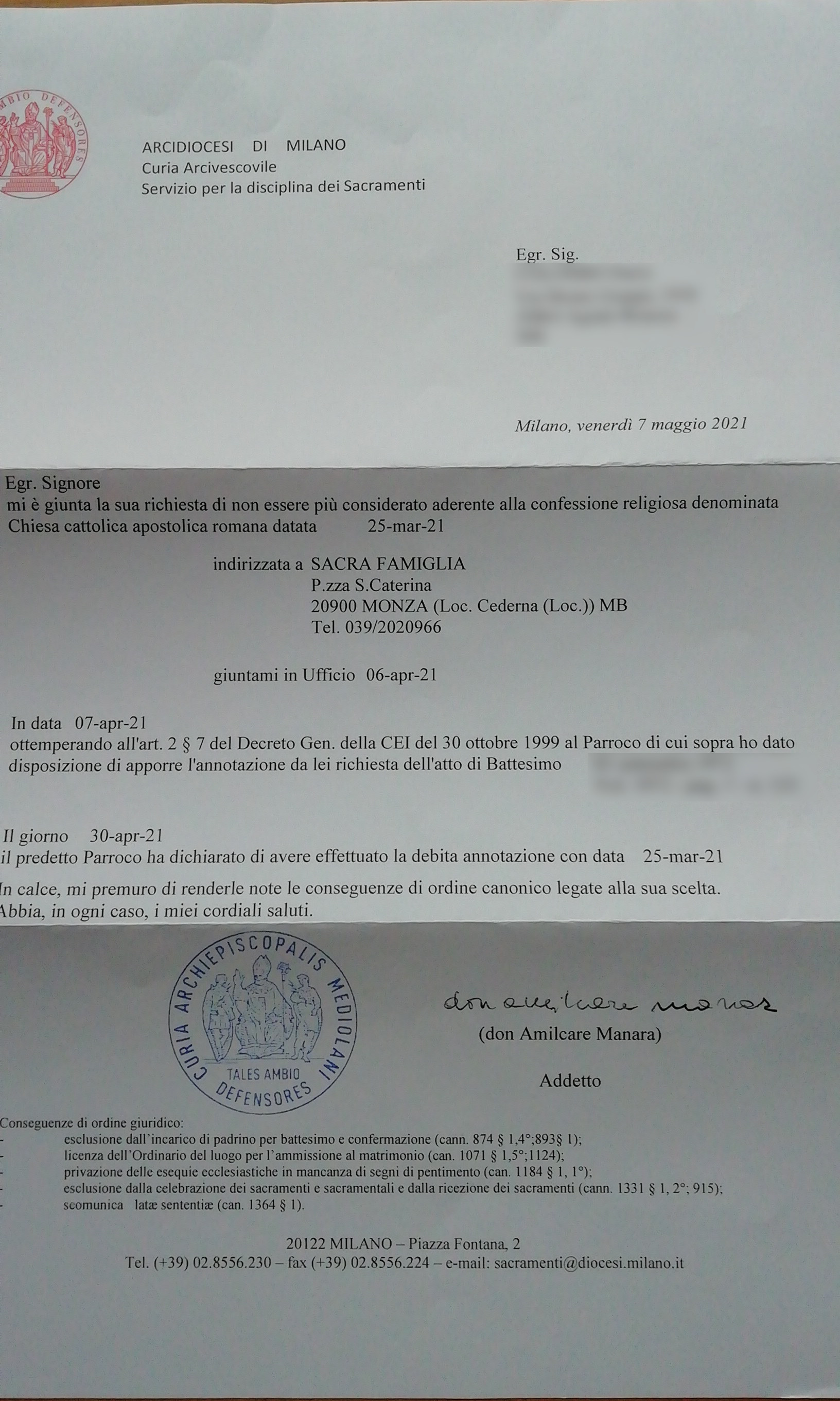 Una persona ha chiesto la rettifica dei dati relativi al proprio battesimo avvenuto a Sacra Famiglia - MONZA (MB) il 14/05/2021, dichiarando di non voler più far parte della Chiesa Cattolica.