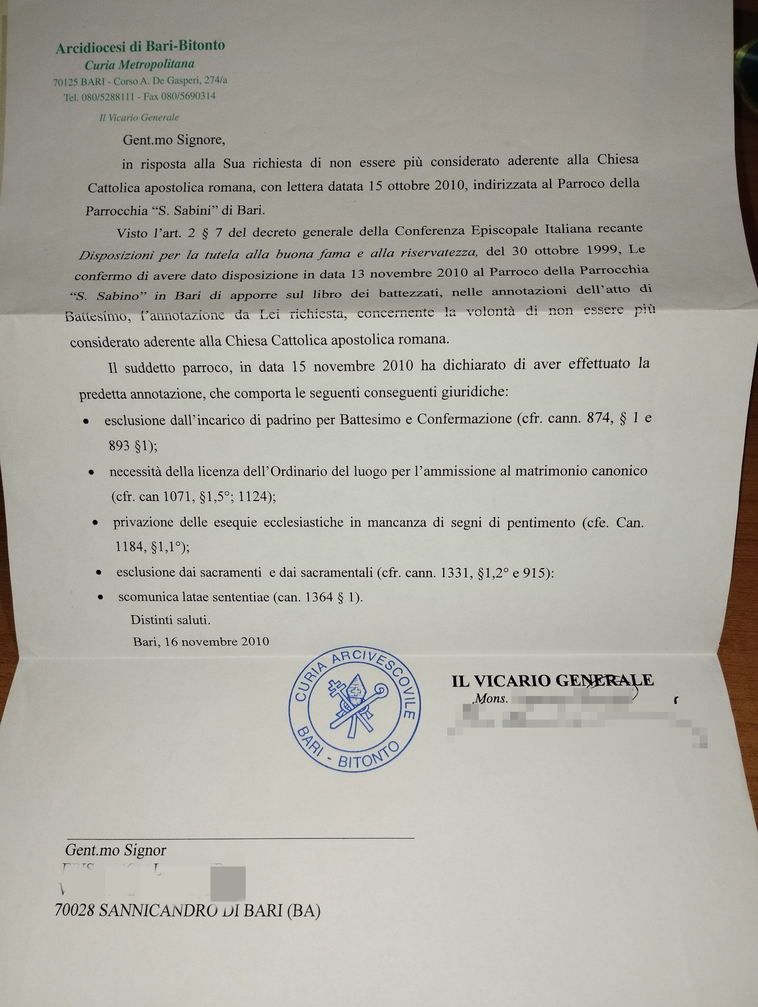 Una persona ha chiesto la rettifica dei dati relativi al proprio battesimo avvenuto a S. Sabino - BARI (BA) il 16/11/2010, dichiarando di non voler più far parte della Chiesa Cattolica.