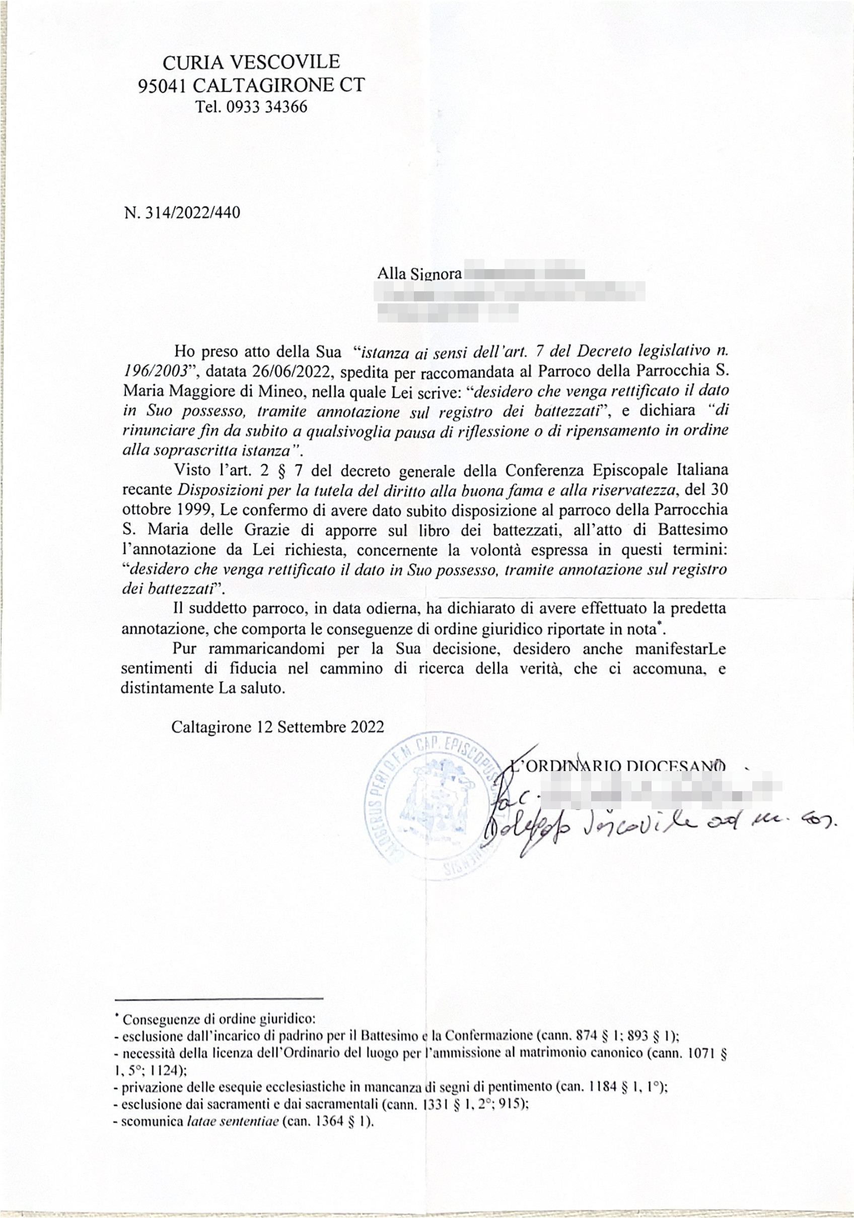 Una persona ha chiesto la rettifica dei dati relativi al proprio battesimo avvenuto a S. Maria Maggiore - MINEO (CT) il 12/09/2022, dichiarando di non voler più far parte della Chiesa Cattolica.