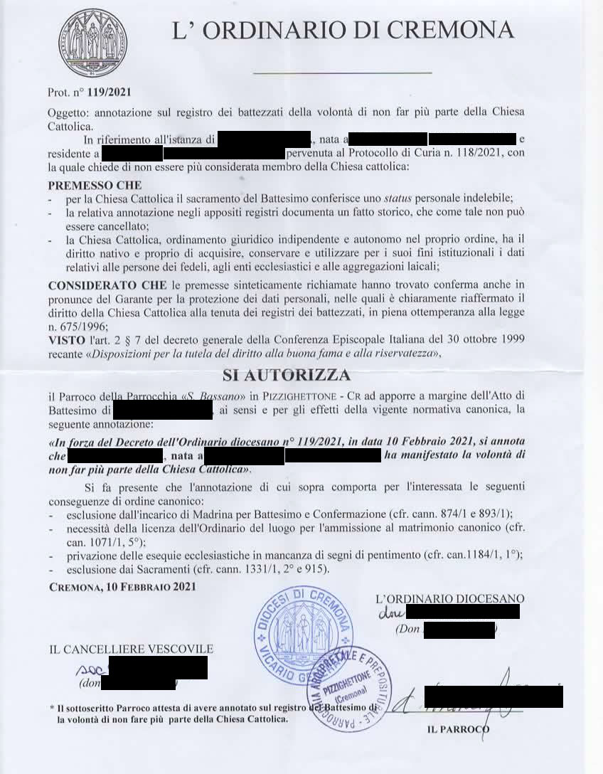 Una persona ha chiesto la rettifica dei dati relativi al proprio battesimo avvenuto a S. Bassano - PIZZIGHETTONE (CR) il 10/02/2021, dichiarando di non voler più far parte della Chiesa Cattolica.