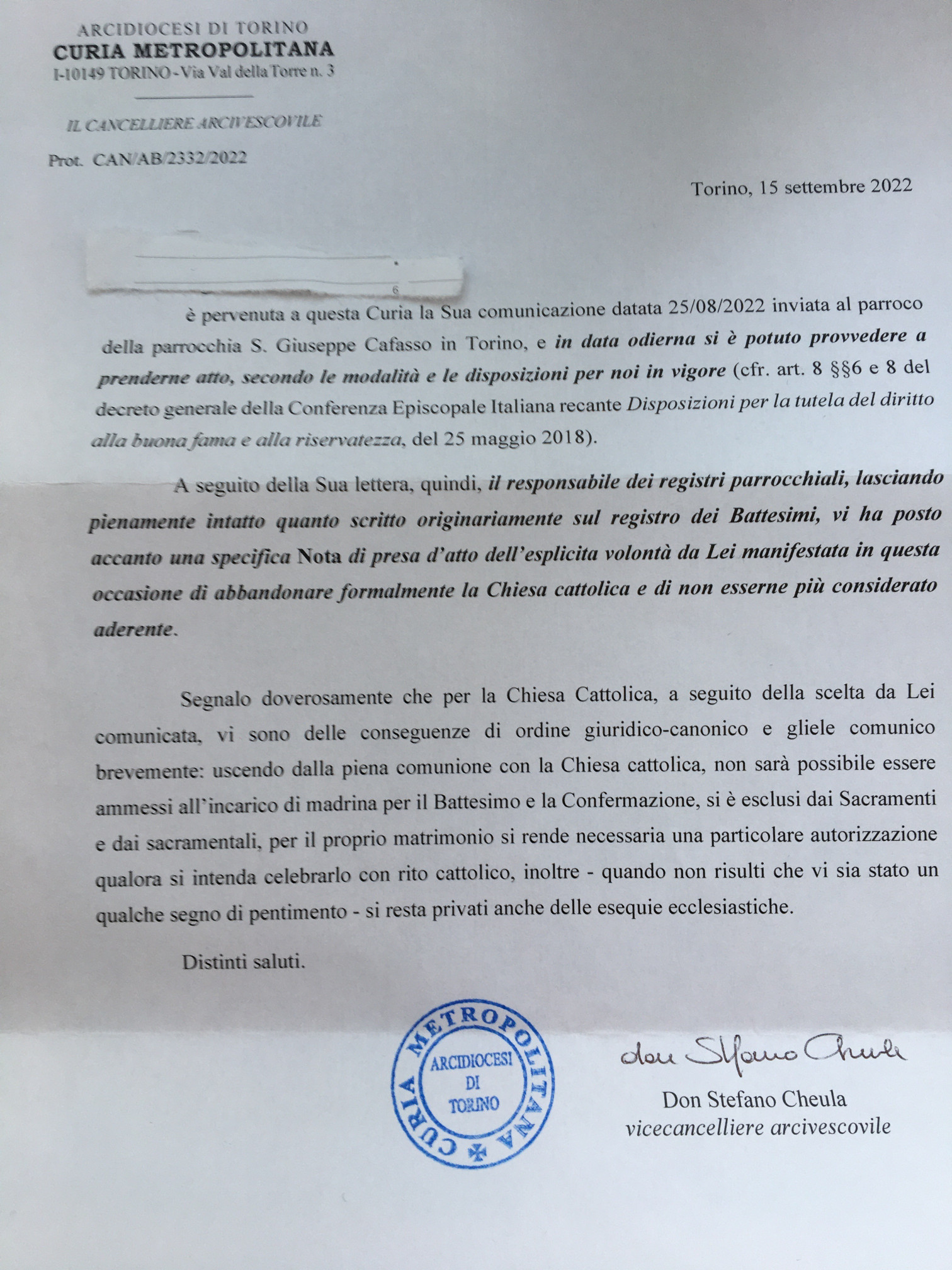 Una persona ha chiesto la rettifica dei dati relativi al proprio battesimo avvenuto a S. Giuseppe Cafasso - TORINO (TO) il 15/09/2022, dichiarando di non voler più far parte della Chiesa Cattolica.