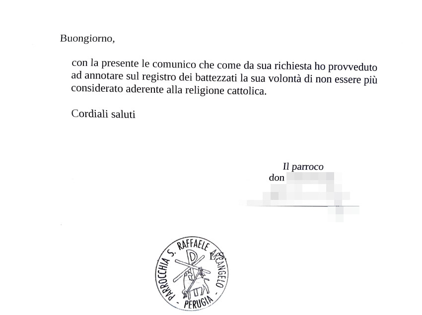 Una persona ha chiesto la rettifica dei dati relativi al proprio battesimo avvenuto a S. Raffaele Arcangelo - PERUGIA (PG) il 10/10/2022, dichiarando di non voler più far parte della Chiesa Cattolica.