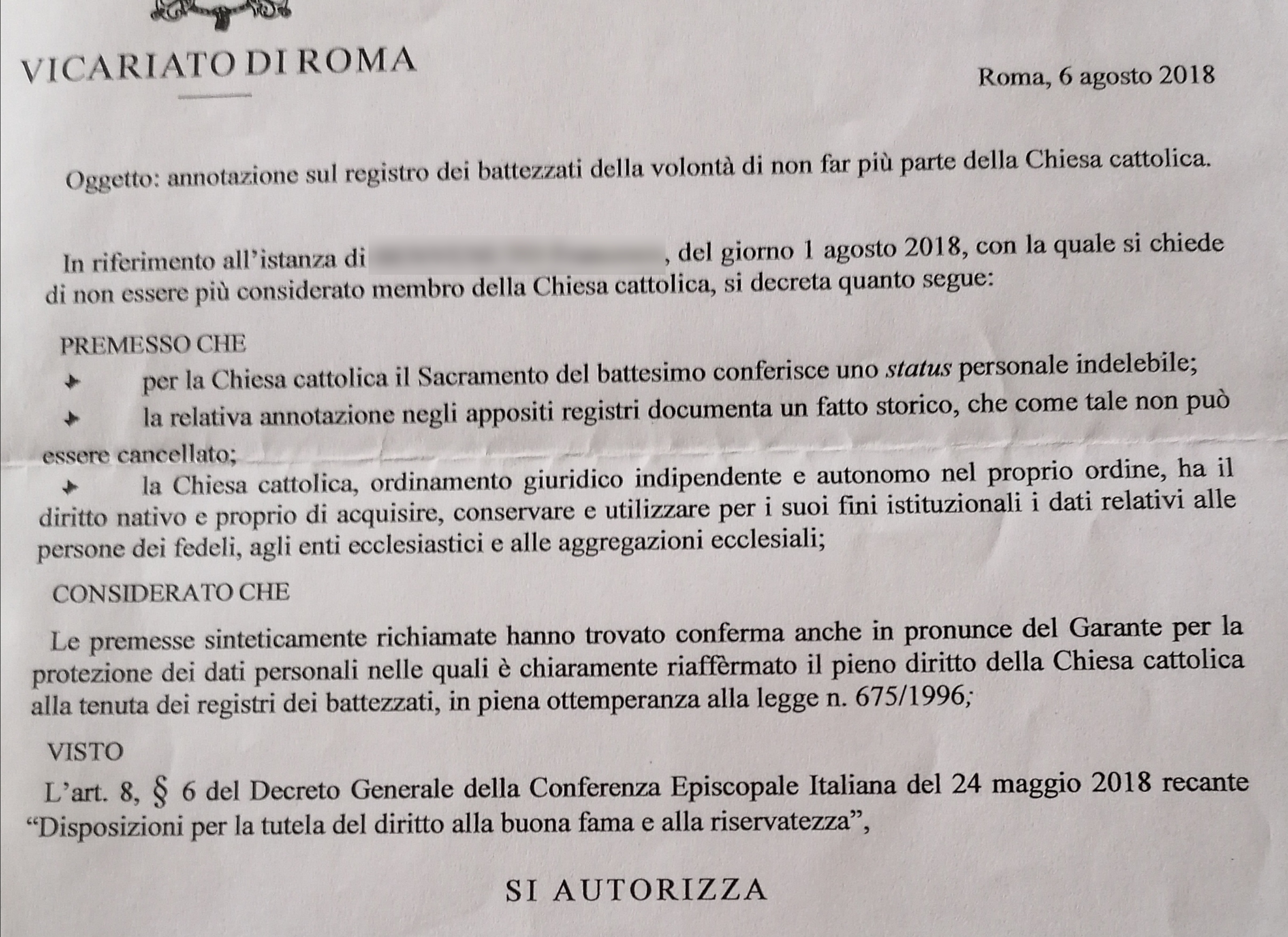 Una persona ha chiesto la rettifica dei dati relativi al proprio battesimo avvenuto a Santi Angeli Custodi - ROMA (RM) il 06/08/2018, dichiarando di non voler più far parte della Chiesa Cattolica.