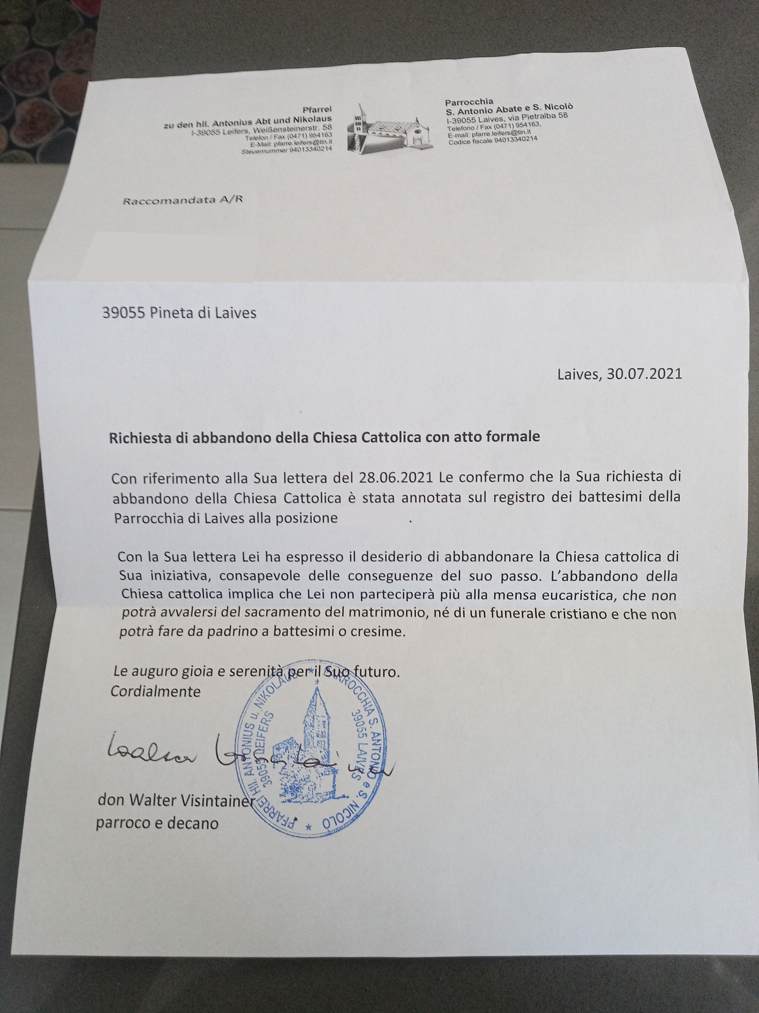 Una persona ha chiesto la rettifica dei dati relativi al proprio battesimo avvenuto a S. Antonio Abate e S. Nicolò - LAIVES (BZ) il 10/08/2021, dichiarando di non voler più far parte della Chiesa Cattolica.