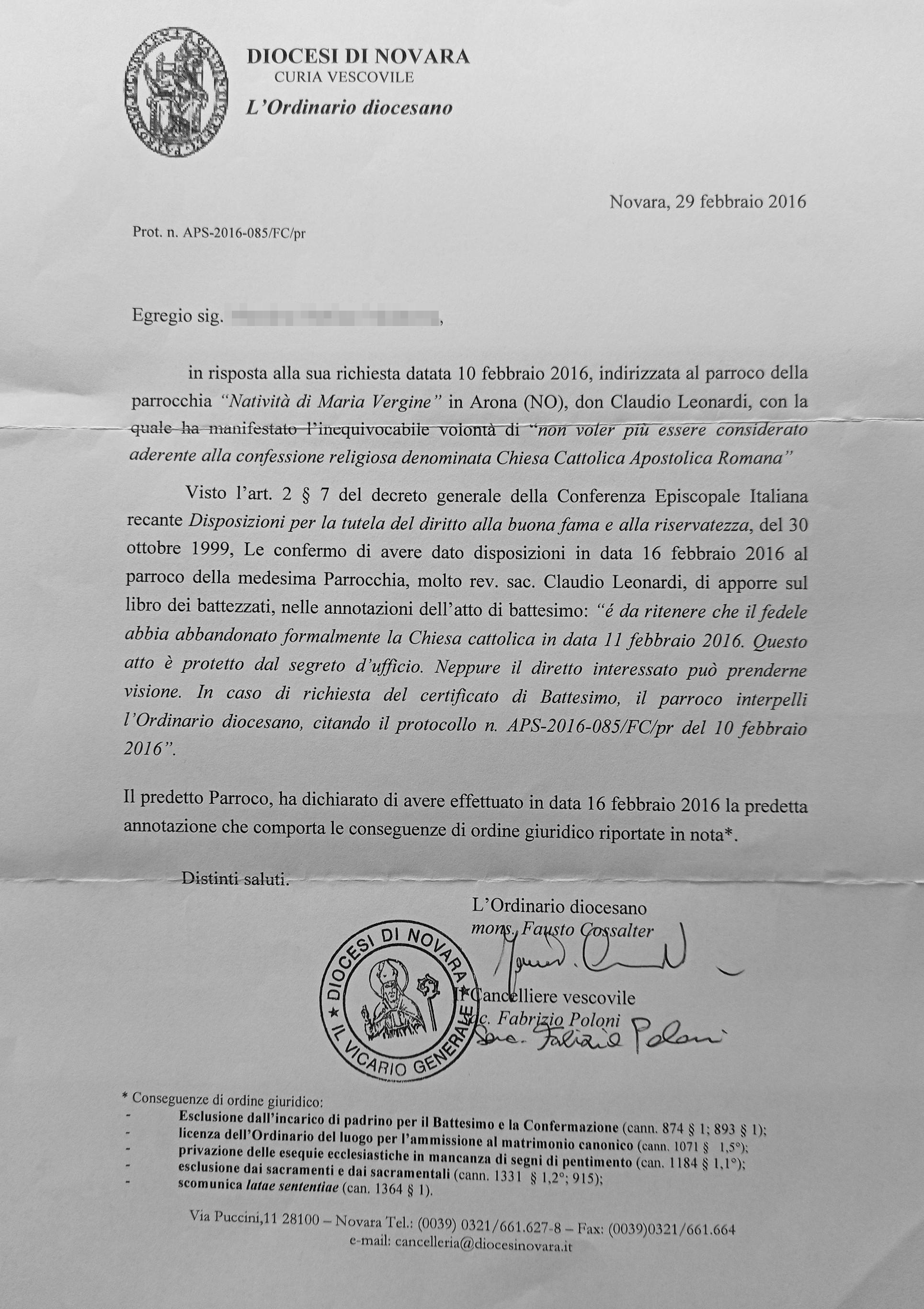 Una persona ha chiesto la rettifica dei dati relativi al proprio battesimo avvenuto a Natività di Maria Vergine - ARONA (NO) il 29/02/2016, dichiarando di non voler più far parte della Chiesa Cattolica.