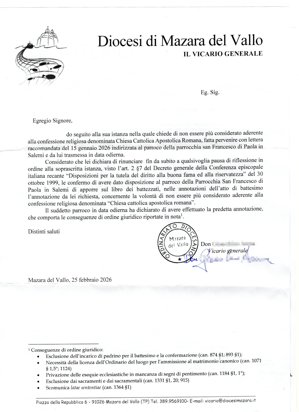 Una persona ha chiesto la rettifica dei dati relativi al proprio battesimo avvenuto a S. Francesco di Paola - SALEMI (TP) il 25/02/2026, dichiarando di non voler più far parte della Chiesa Cattolica.
