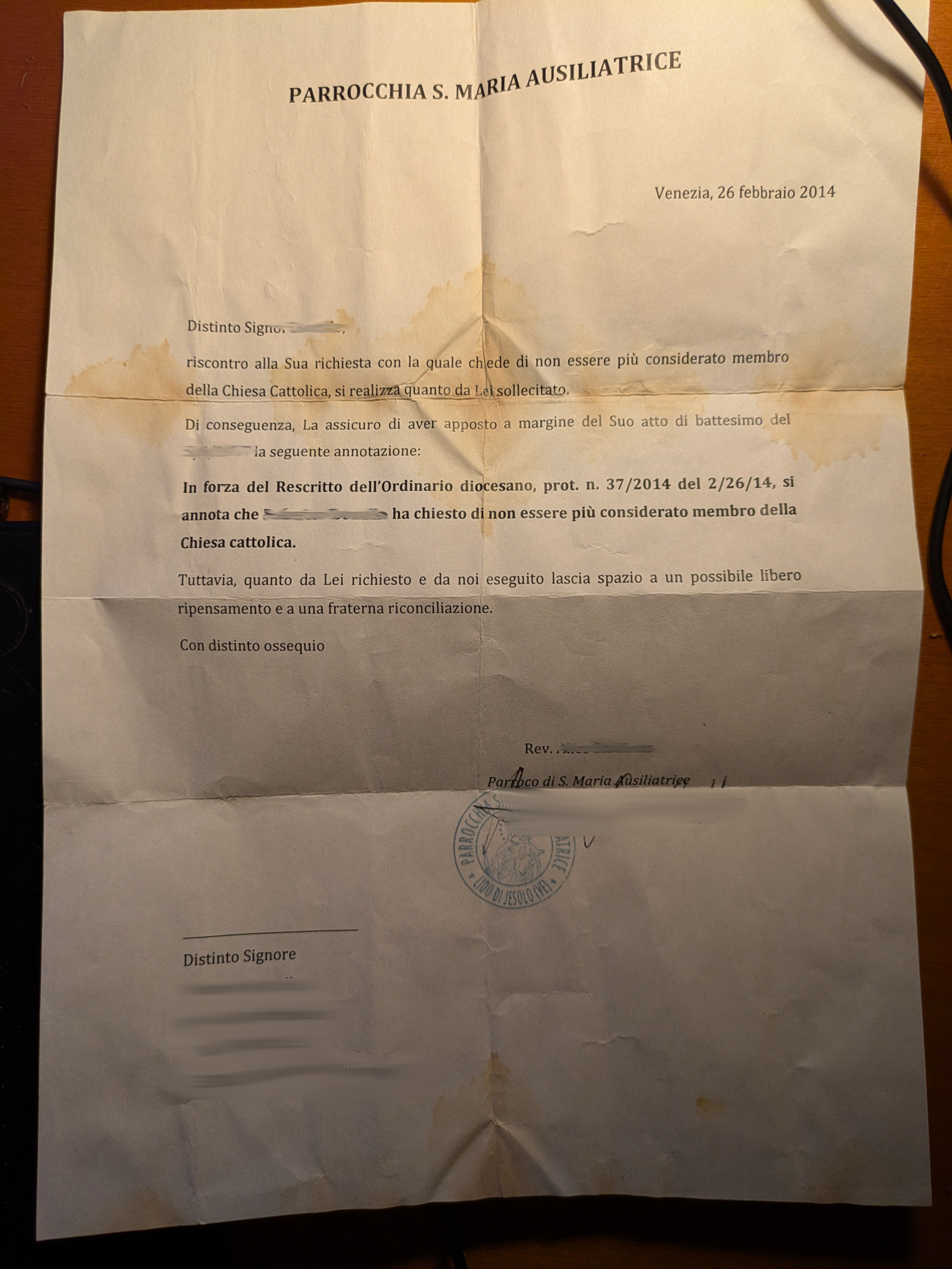 Una persona ha chiesto la rettifica dei dati relativi al proprio battesimo avvenuto a S. Maria Ausiliatrice - JESOLO (VE) il 26/02/2014, dichiarando di non voler più far parte della Chiesa Cattolica.