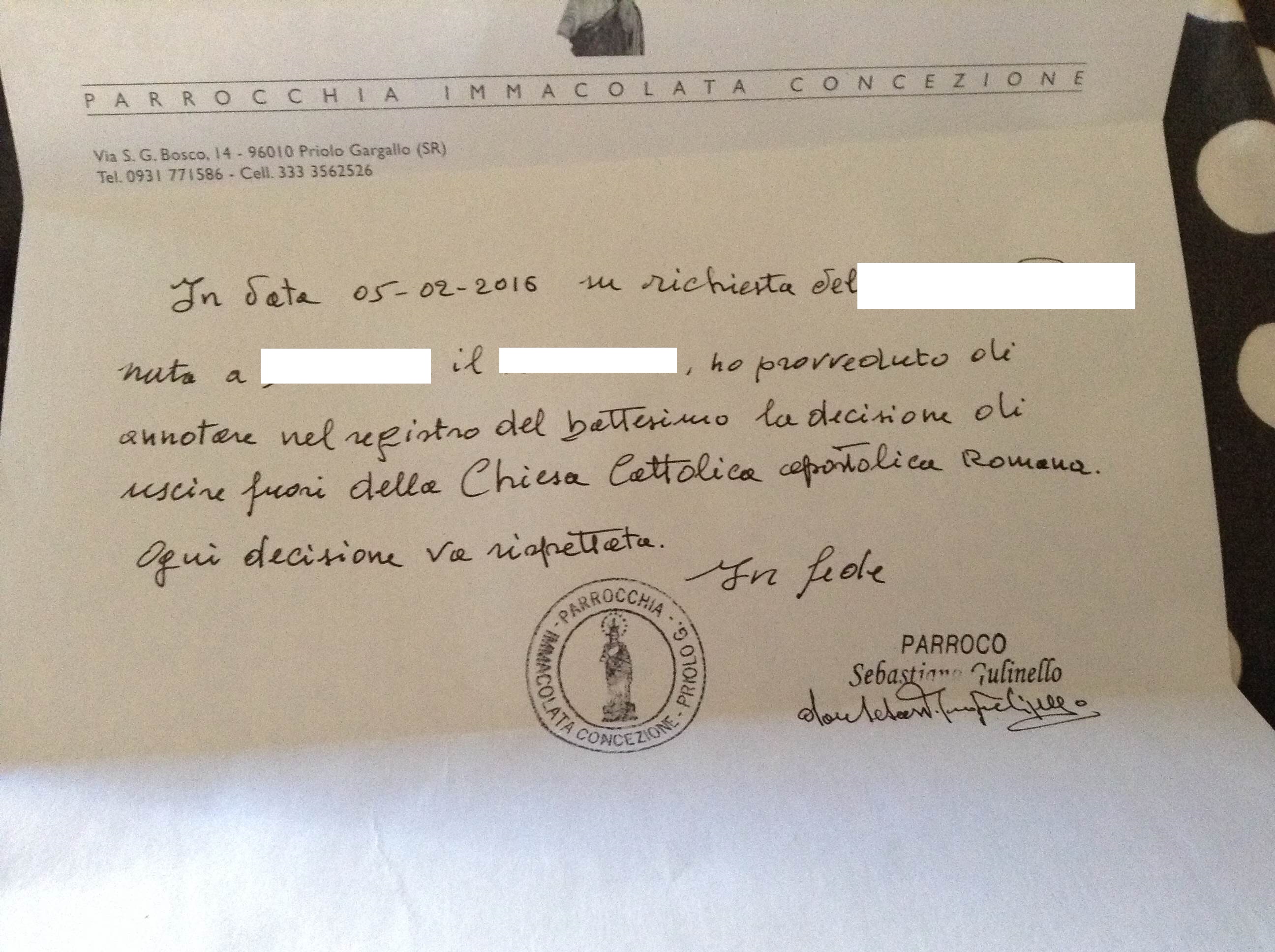 Una persona ha chiesto la rettifica dei dati relativi al proprio battesimo avvenuto a Immacolata Concezione - PRIOLO GARGALLO (SR) il 05/02/2016, dichiarando di non voler più far parte della Chiesa Cattolica.