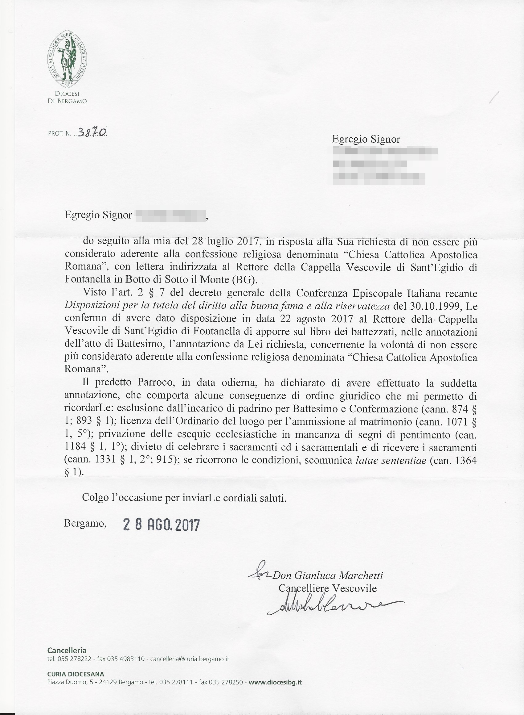 Una persona ha chiesto la rettifica dei dati relativi al proprio battesimo avvenuto a Sacro Cuore di Gesù e S. Egidio Abate - SOTTO IL MONTE GIOVANNI XXIII (BG) il 28/08/2017, dichiarando di non voler più far parte della Chiesa Cattolica.