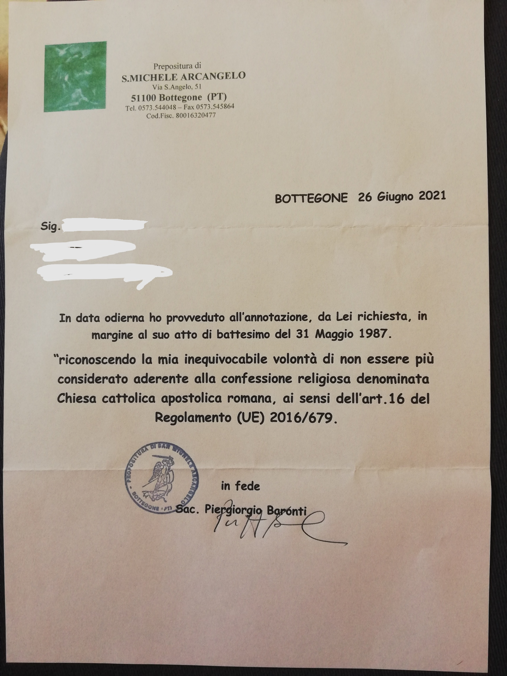 Una persona ha chiesto la rettifica dei dati relativi al proprio battesimo avvenuto a S. Michele Arcangelo in S. Angelo a Piuvica - PISTOIA (PT) il 26/06/2021, dichiarando di non voler più far parte della Chiesa Cattolica.