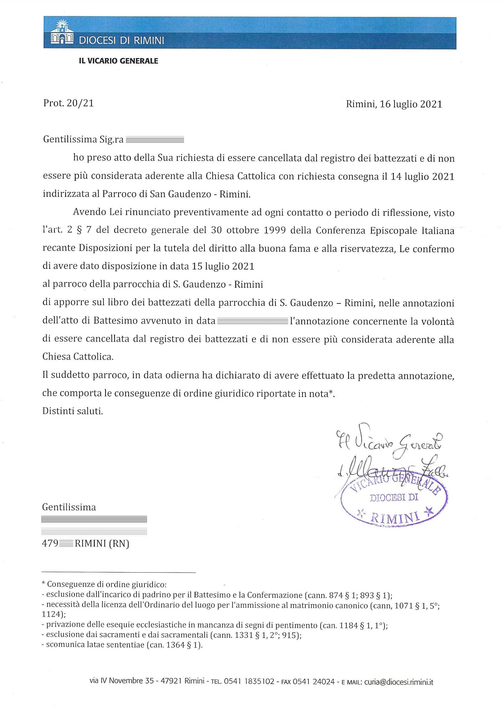 Una persona ha chiesto la rettifica dei dati relativi al proprio battesimo avvenuto a S. Gaudenzo - RIMINI (RN) il 21/07/2021, dichiarando di non voler più far parte della Chiesa Cattolica.