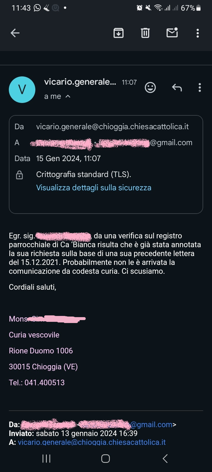 Una persona ha chiesto la rettifica dei dati relativi al proprio battesimo avvenuto a Beata Vergine del Rosario - CHIOGGIA (VE) il 15/01/2024, dichiarando di non voler più far parte della Chiesa Cattolica.