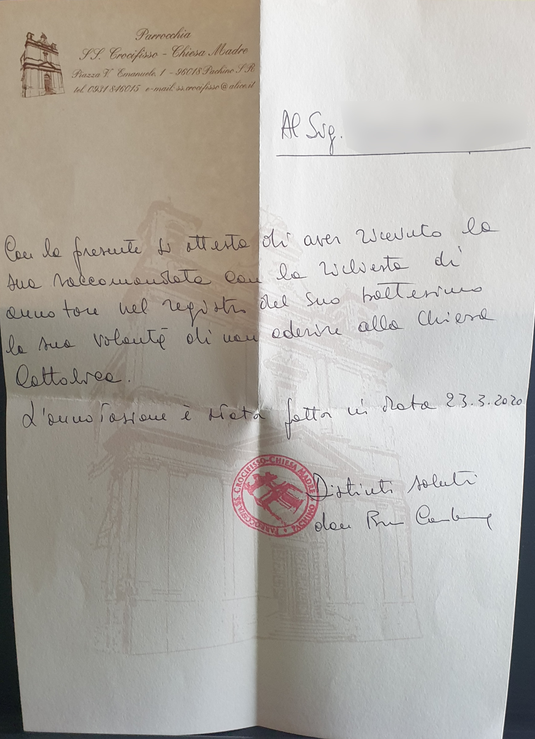 Una persona ha chiesto la rettifica dei dati relativi al proprio battesimo avvenuto a Ss. Crocifisso-Chiesa Madre - PACHINO (SR) il 30/03/2020, dichiarando di non voler più far parte della Chiesa Cattolica.