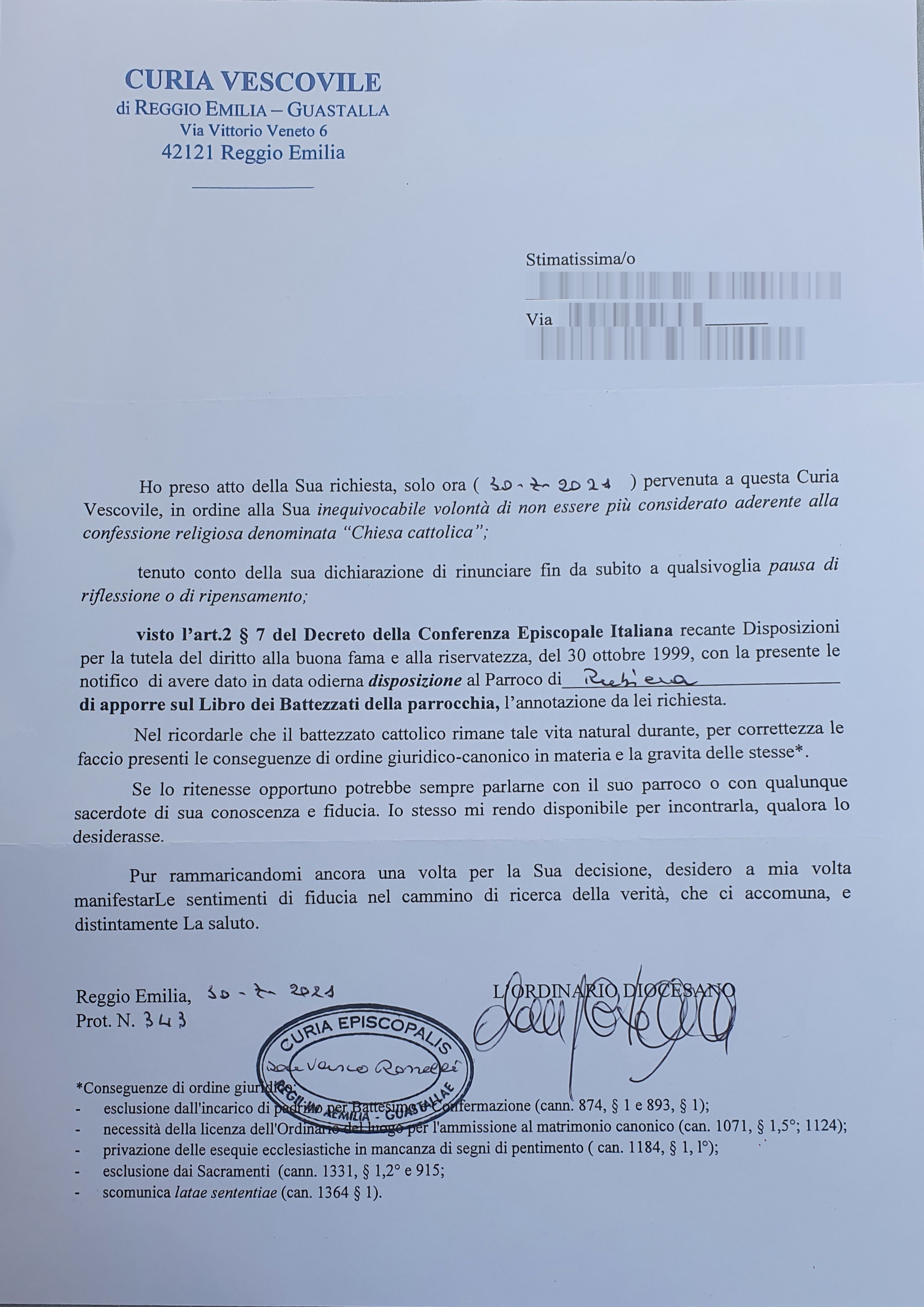 Una persona ha chiesto la rettifica dei dati relativi al proprio battesimo avvenuto a Ss. Fabiano e Sebastiano Mm. - RUBIERA (RE) il 30/07/2021, dichiarando di non voler più far parte della Chiesa Cattolica.