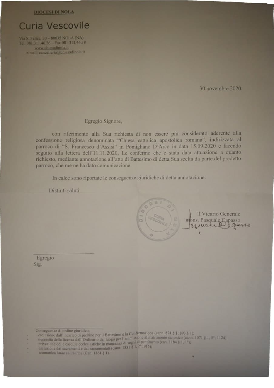 Innanzitutto ringrazio l'UAAR per il supporto che mi ha dato: sono stati gentilissimi, disponibili e mi hanno fornito tutta la documentazione e informazioni che necessitavo, facilitandomi ulteriormente la procedura dello sbatezzo. Riguardo la mia esperienza, invece, sono arrivato quasi al dovermi rivolgere al Garante della Privacy. La prima lettera, inviata al parroco, è stata completamente ignorata nonostante la conferma di lettura. Mi è venuto quindi in aiuto il supporto dell'UAAR che prontamente mi ha dato indicazioni su come proseguire, Ho quindi inviato un modulo, fornito dall'UAAR, al parroco e al vescovo... insieme ad un'email alla diocesi in cui avvisavo della questione. Fatto ciò mi è arrivata la tanto attesa lettera con cui posso sfoggiare la mia scomunica 'latae sententiae' :)