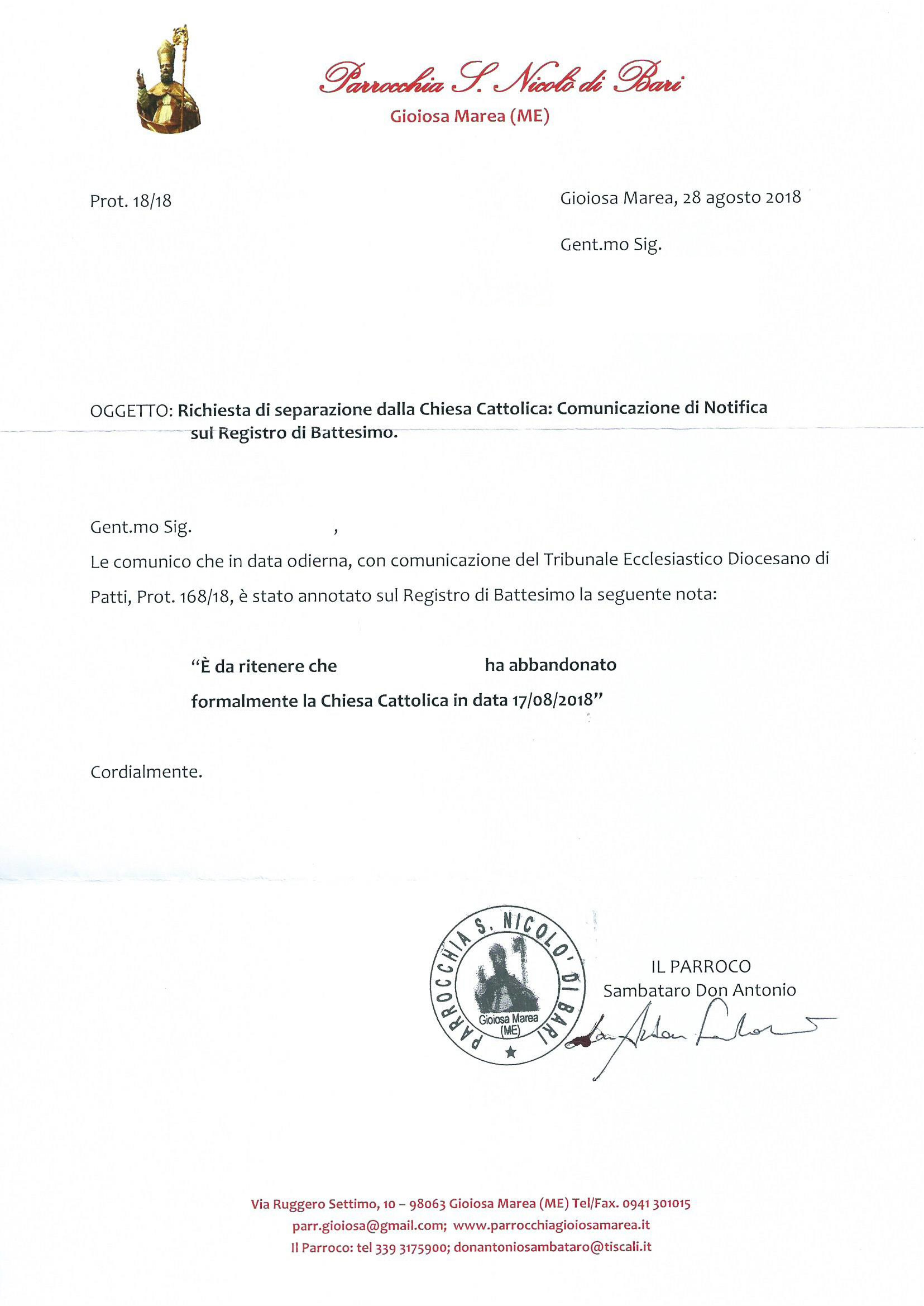 Una persona ha chiesto la rettifica dei dati relativi al proprio battesimo avvenuto a San Nicolò di Bari - GIOIOSA MAREA (ME) il 28/08/2018, dichiarando di non voler più far parte della Chiesa Cattolica.