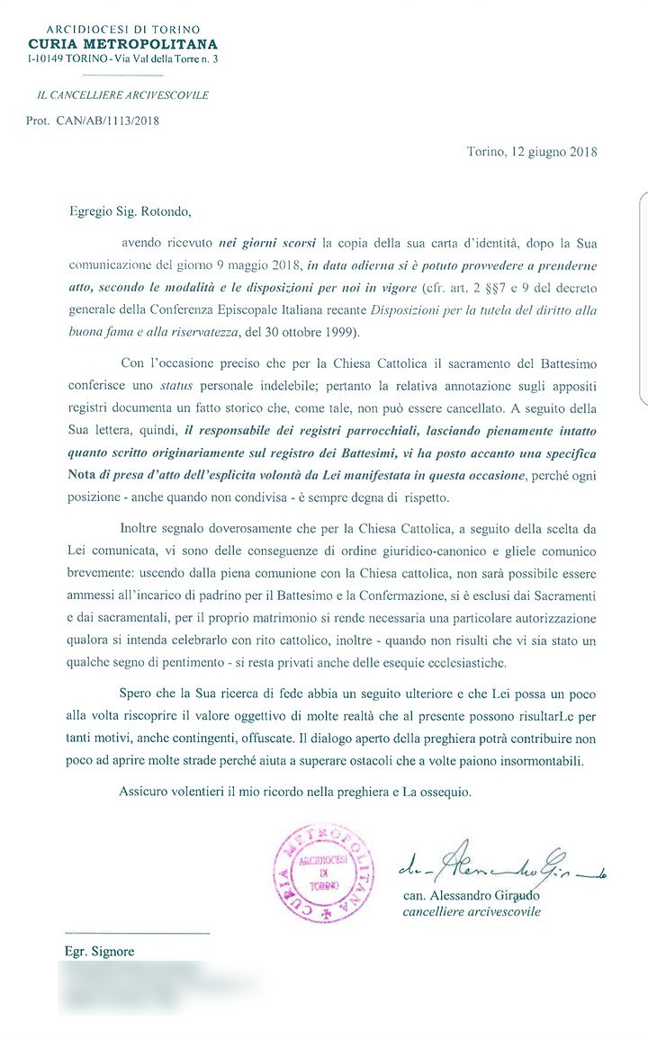 Una persona ha chiesto la rettifica dei dati relativi al proprio battesimo avvenuto a Ss. Trinità - NICHELINO (TO) il 12/06/2018, dichiarando di non voler più far parte della Chiesa Cattolica.
