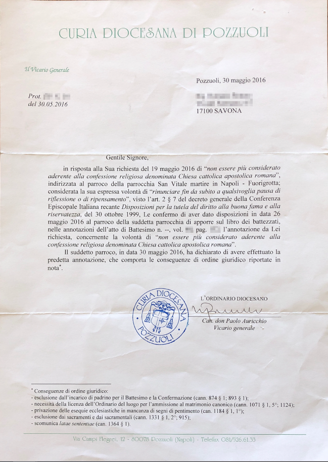 Una persona ha chiesto la rettifica dei dati relativi al proprio battesimo avvenuto a S. Vitale M. - NAPOLI (NA) il 30/05/2016, dichiarando di non voler più far parte della Chiesa Cattolica.