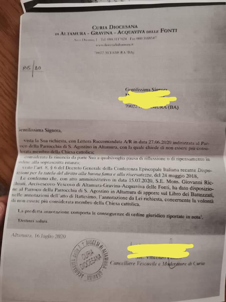 Una persona ha chiesto la rettifica dei dati relativi al proprio battesimo avvenuto a S. Agostino - ALTAMURA (BA) il 16/07/2020, dichiarando di non voler più far parte della Chiesa Cattolica.