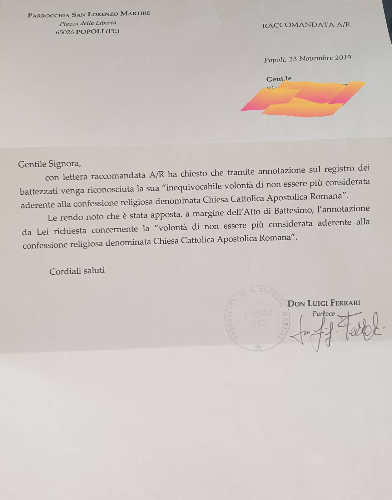Una persona ha chiesto la rettifica dei dati relativi al proprio battesimo avvenuto a San Lorenzo Martire - POPOLI (PE) il 13/11/2019, dichiarando di non voler più far parte della Chiesa Cattolica.
