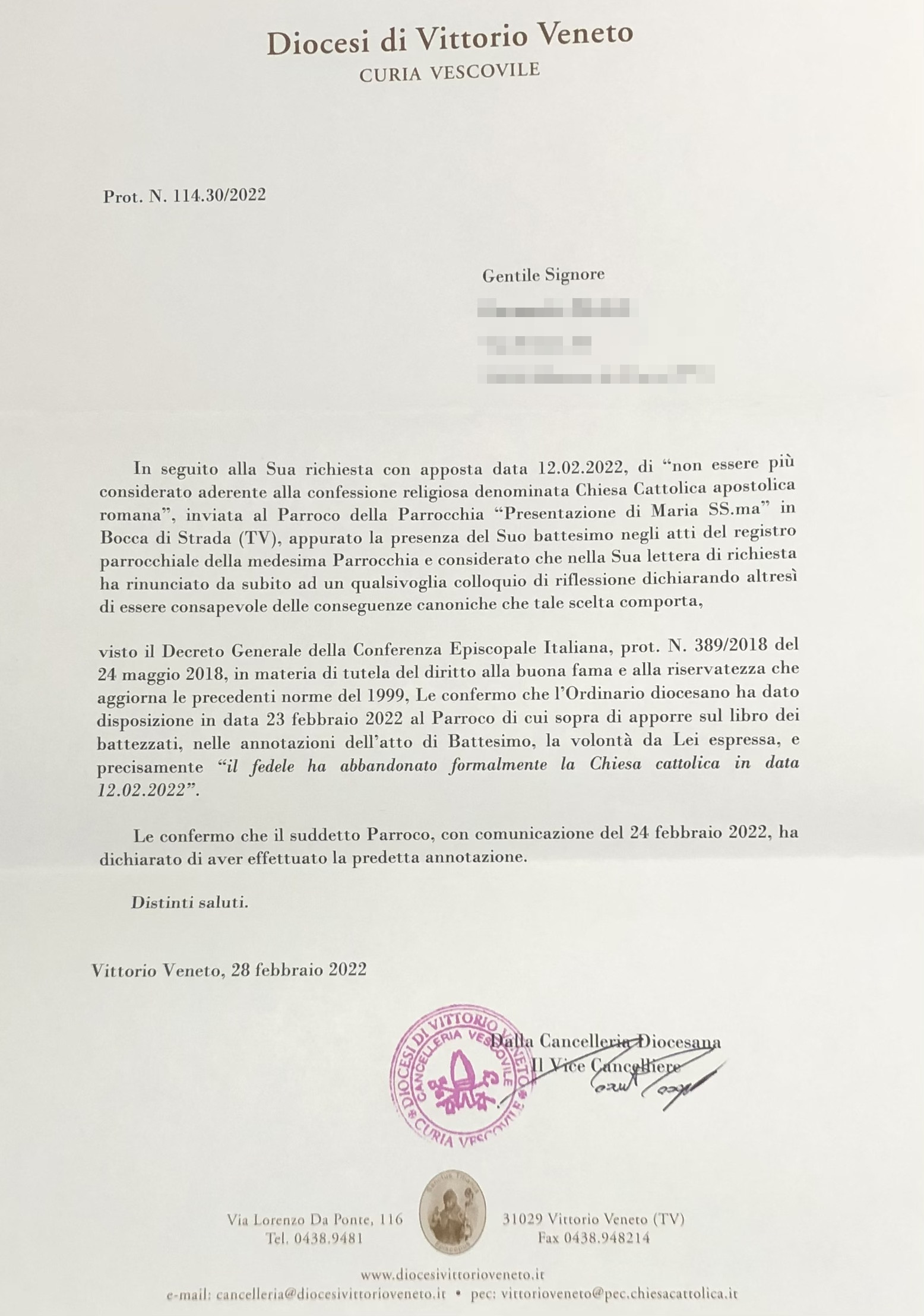 Una persona ha chiesto la rettifica dei dati relativi al proprio battesimo avvenuto a Presentazione di Maria Ss. - MARENO DI PIAVE (TV) il 24/02/2022, dichiarando di non voler più far parte della Chiesa Cattolica.