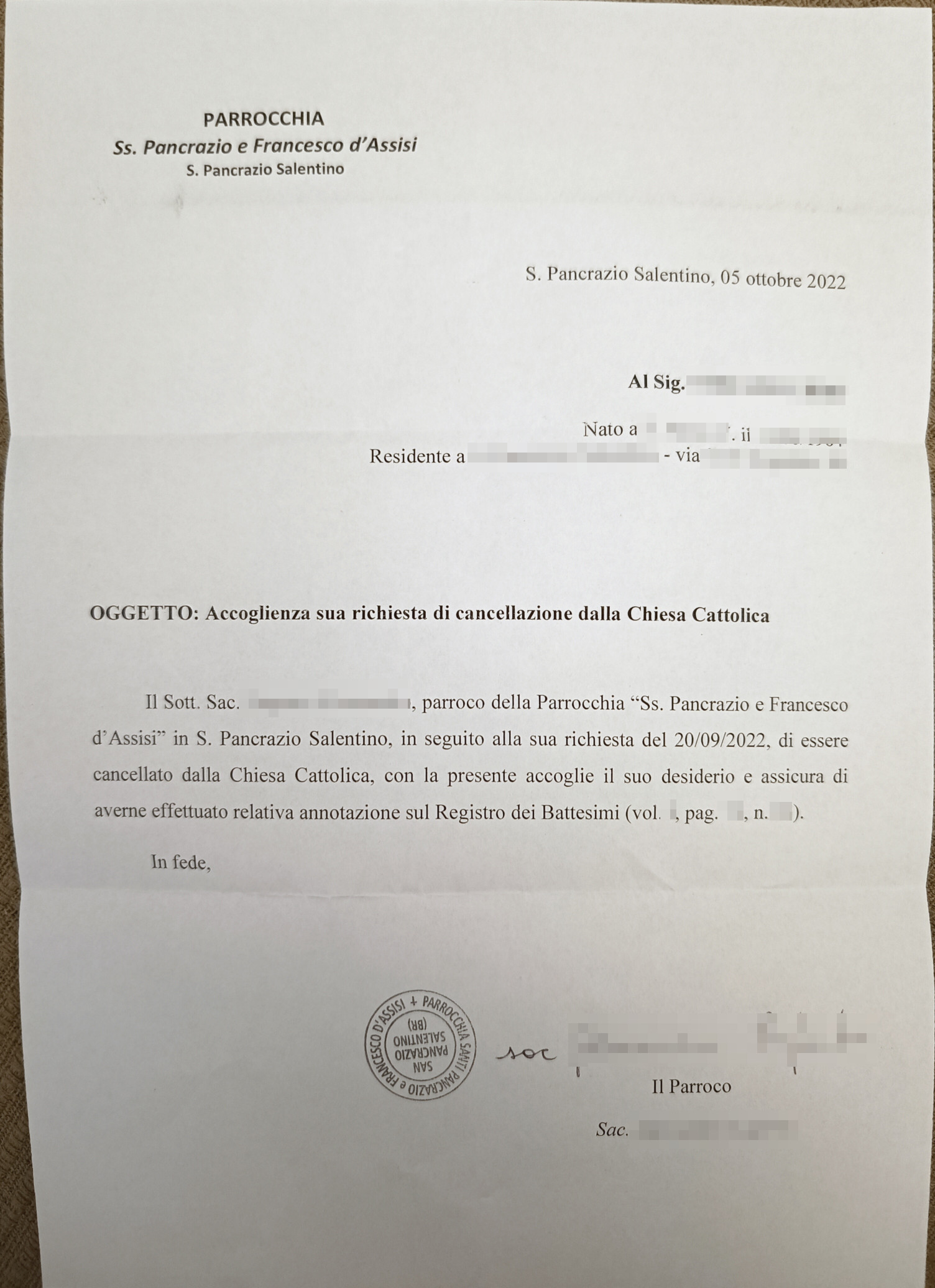 Una persona ha chiesto la rettifica dei dati relativi al proprio battesimo avvenuto a Santi Pancrazio e Francesco d'Assisi - SAN PANCRAZIO SALENTINO (BR) il 05/10/2022, dichiarando di non voler più far parte della Chiesa Cattolica.