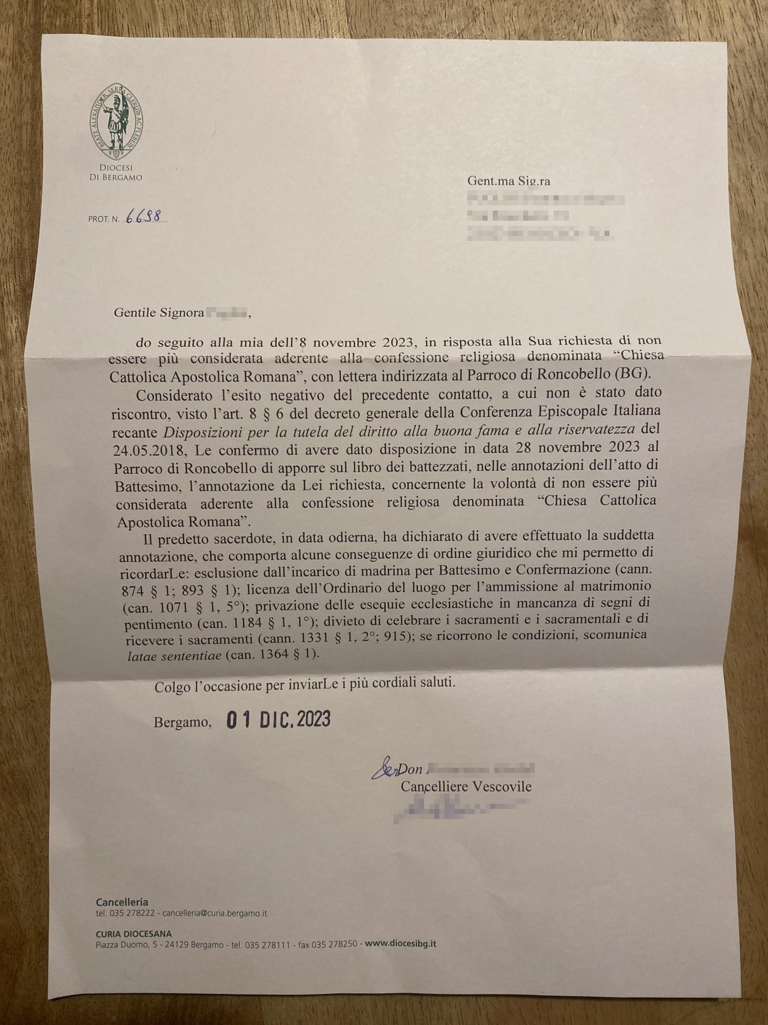 Una persona ha chiesto la rettifica dei dati relativi al proprio battesimo avvenuto a Santi Pietro Paolo e Giacomo Apostoli e S. Maria Assunta - RONCOBELLO (BG) il 28/11/2023, dichiarando di non voler più far parte della Chiesa Cattolica.