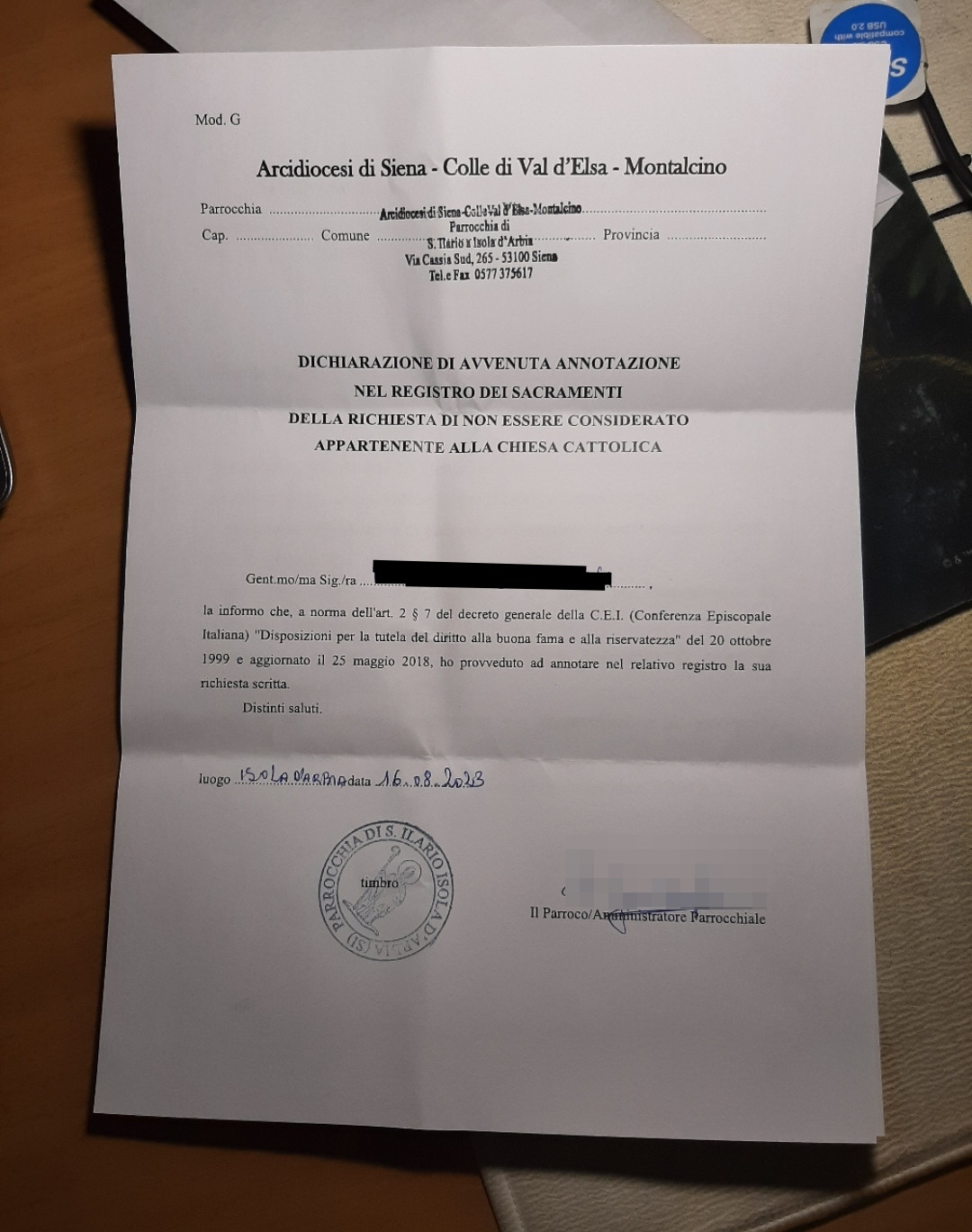 Una persona ha chiesto la rettifica dei dati relativi al proprio battesimo avvenuto a S. Ilario a Isola - SIENA (SI) il 16/08/2023, dichiarando di non voler più far parte della Chiesa Cattolica.