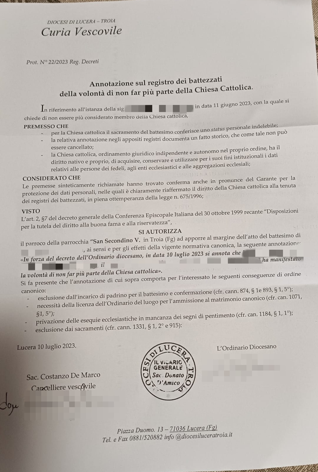 Una persona ha chiesto la rettifica dei dati relativi al proprio battesimo avvenuto a S. Secondino Vescovo - TROIA (FG) il 21/07/2023, dichiarando di non voler più far parte della Chiesa Cattolica.