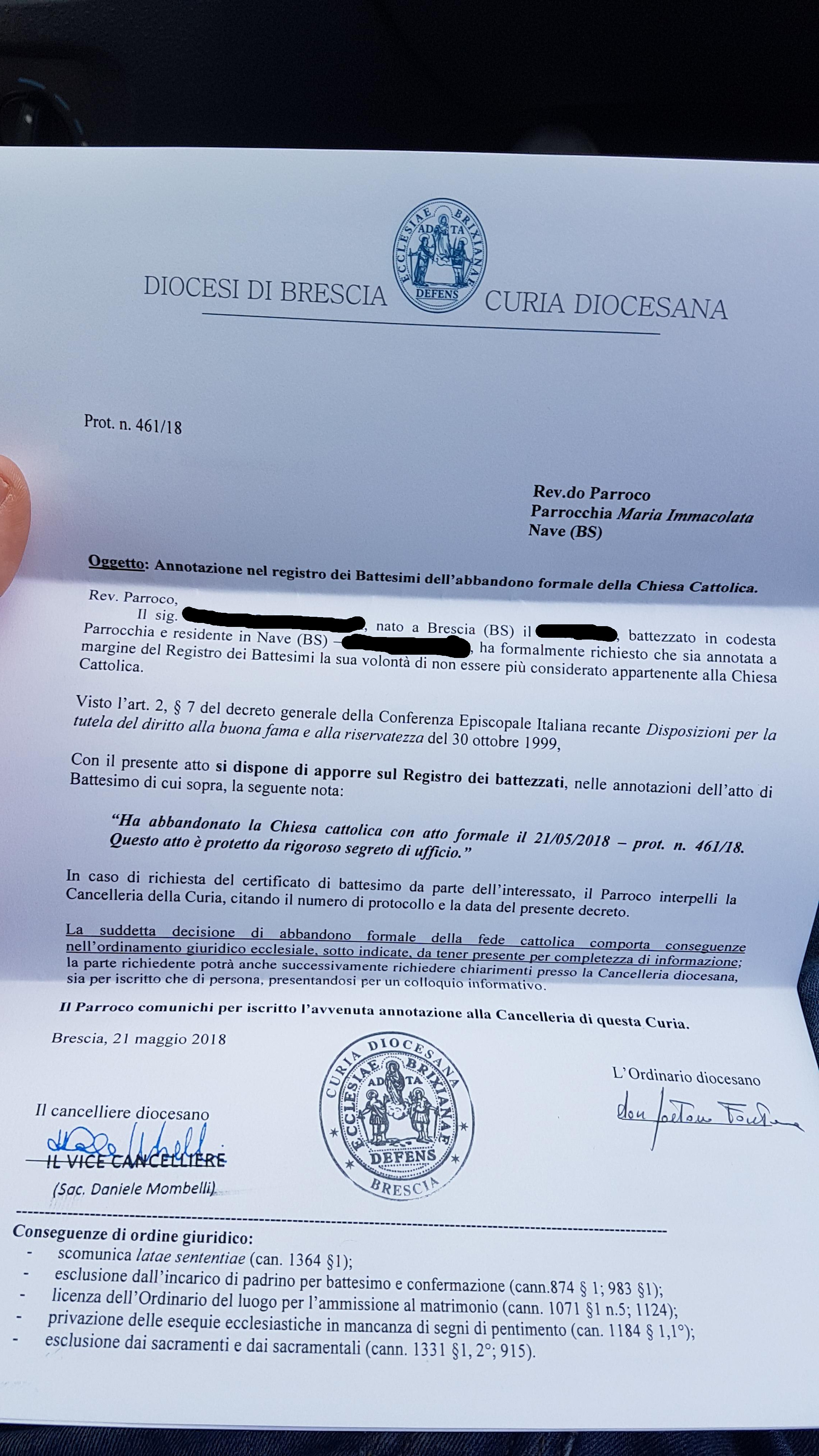 Una persona ha chiesto la rettifica dei dati relativi al proprio battesimo avvenuto a Maria Immacolata - NAVE (BS) il 21/05/2018, dichiarando di non voler più far parte della Chiesa Cattolica.