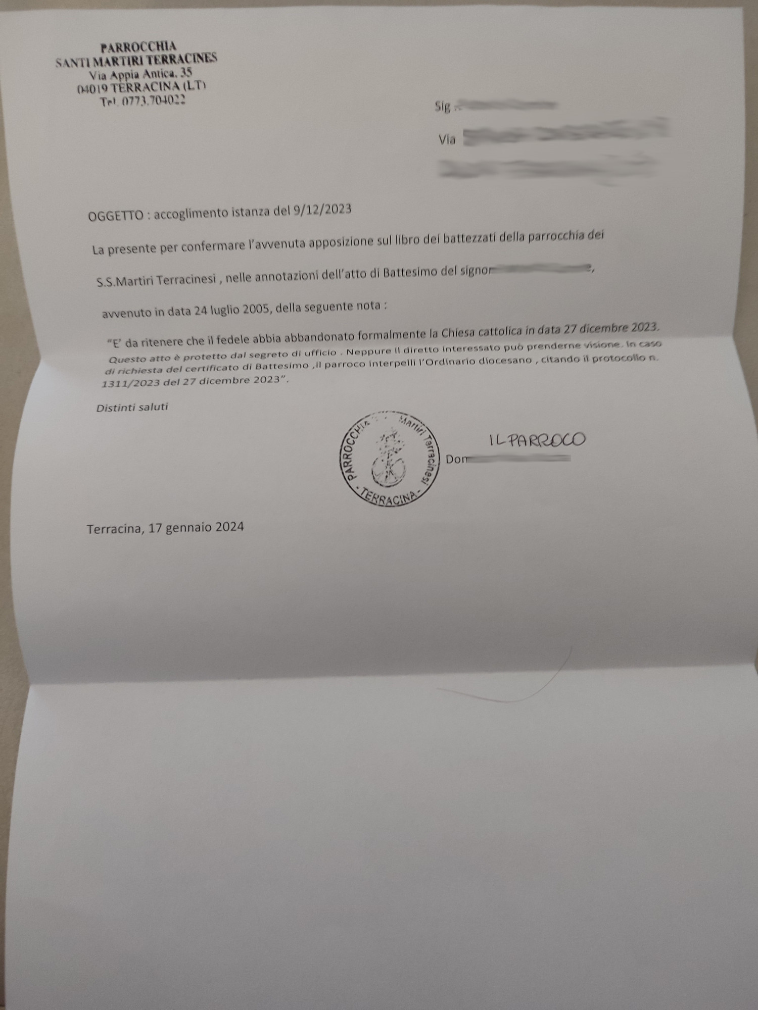 Una persona ha chiesto la rettifica dei dati relativi al proprio battesimo avvenuto a Santi Martiri Terracinesi - TERRACINA (LT) il 23/01/2024, dichiarando di non voler più far parte della Chiesa Cattolica.