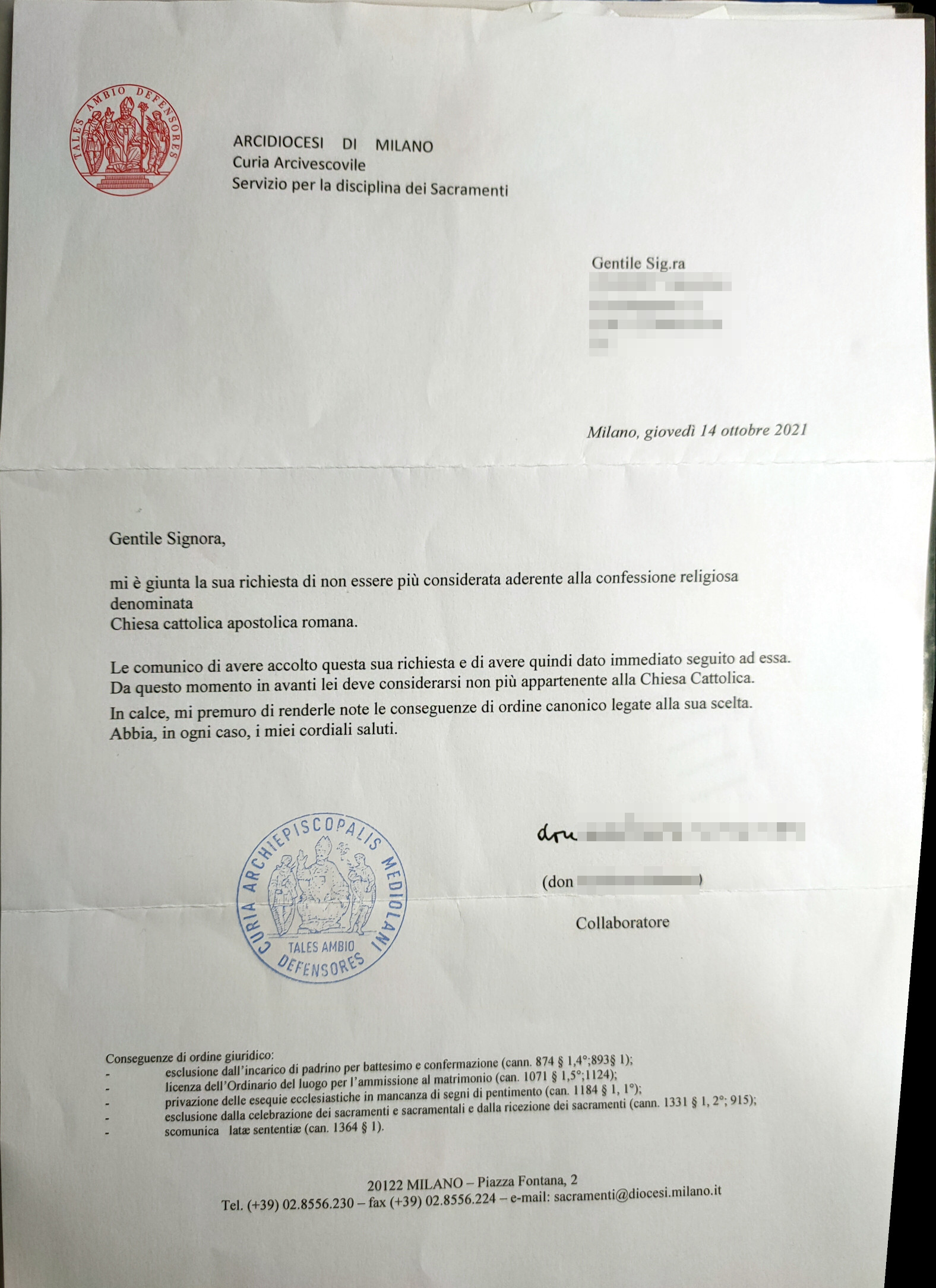 Una persona ha chiesto la rettifica dei dati relativi al proprio battesimo avvenuto a Madonna della Medaglia Miracolosa - MILANO (MI) il 14/10/2021, dichiarando di non voler più far parte della Chiesa Cattolica.