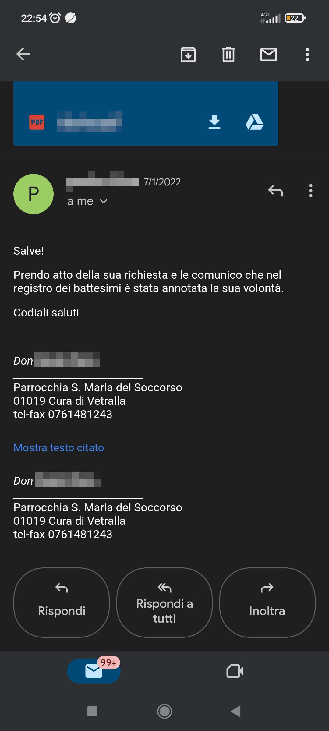 Una persona ha chiesto la rettifica dei dati relativi al proprio battesimo avvenuto a S. Maria del Soccorso - VETRALLA (VT) il 07/01/2022, dichiarando di non voler più far parte della Chiesa Cattolica.