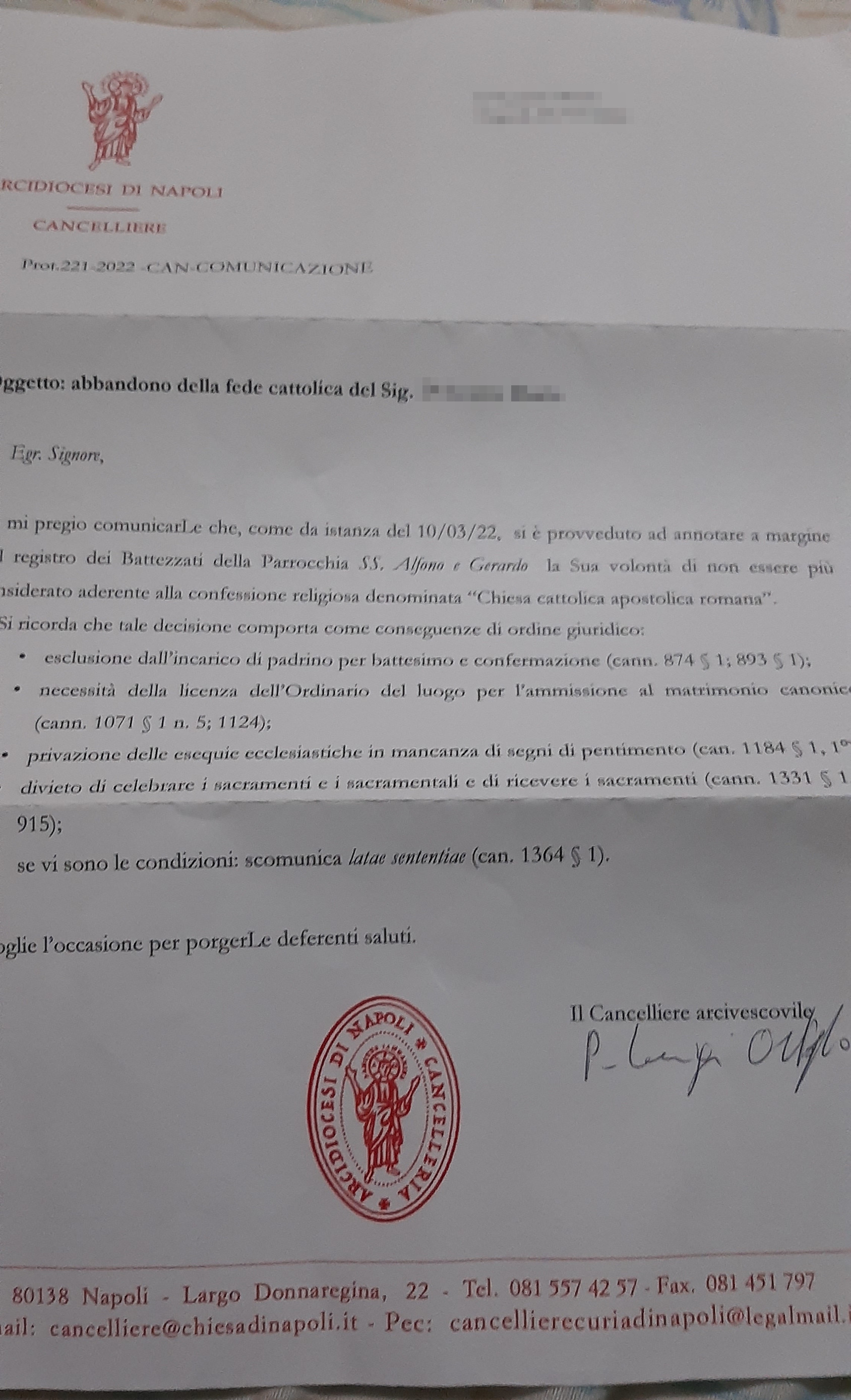 Una persona ha chiesto la rettifica dei dati relativi al proprio battesimo avvenuto a Santi Alfonso M. De' Liguori e Gerardo - NAPOLI (NA) il 24/03/2022, dichiarando di non voler più far parte della Chiesa Cattolica.
